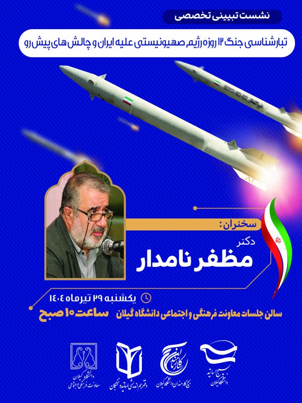 نشست تبیینی–تخصصی با عنوان « تبارشناسی جنگ ۱۲ روزه رژیم صهیونیستی علیه ایران و چالش‌های پیش‌رو » روز یکشنبه ۲۹ تیرماه ۱۴۰۴ با سخنرانی دکتر مظفر نامدار، پژوهشگر ارشد حوزه سیاست و تاریخ معاصر، در سالن جلسات معاونت فرهنگی و اجتماعی دانشگاه گیلان برگزار شد. این نشست با همت بسیج اساتید دانشگاه گیلان و با همکاری بسیج کارکنان، دفتر هم‌اندیشی اساتید و نخبگان، و معاونت فرهنگی و اجتماعی دانشگاه برگزار شد. در این نشست، دکتر نامدار با نگاهی تاریخی و تحلیلی به ریشه‌های دشمنی رژیم صهیونیستی با جمهوری اسلامی ایران و مردم ایران پرداخت. وی ضمن بررسی روند شکل‌گیری این تقابل در دهه‌های گذشته، جنگ ۱۲ روزه اخیر را امتداد یک تقابل دیرینه و نظام‌مند تاریخی خواند که در چارچوب منافع راهبردی رژیم صهیونیستی و حامیان غربی آن قابل تحلیل است. وی تأکید کرد که تحلیل صحیح از گذشته، درک واقع‌بینانه از حال و آمادگی برای آینده در حوزه سیاست خارجی جمهوری اسلامی ایران، نیازمند واکاوی عمیق در ابعاد تاریخی، فرهنگی و امنیتی این دشمنی است. این نشست با استقبال اعضای هیئت علمی، یاوران علمی، دانشجویان و علاقه‌مندان به مسائل سیاسی و راهبردی همراه بود و فرصتی برای گفت‌وگوی نخبگانی پیرامون چالش‌های پیش روی جمهوری اسلامی ایران در حوزه دیپلماسی منطقه‌ای و بین‌المللی فراهم کرد.