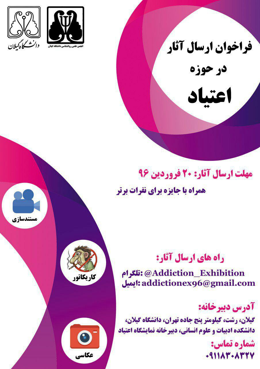 با توجه به برگزاری نمایشگاه اعتیاد در تاریخ 27، 28، 29 فروردین ماه سال 1396، نخستین مسابقه دانشجویی با محوریت اعتیاد برگزار خواهدشد. این مسابقه با همت انجمن علمی روانشناسی دانشگاه و با همکاری کانونهای فرهنگی و اجتماعی دانشگاه گیلان برگزار می گردد علاقه مندان میتوانند آثار خود را تا تاریخ ۲۰ فروردین ماه ۱۳۹۶ از طریق روشهای زیر به دبیر خانه نمایشگاه مذکور ارسال نمایند به نفرات برتر در هر کدام از محورها جوایز نفیسی تعلق میگیرد. موضوع ارسال آثار با محوریت اعتیاد : عکس کاریکاتور مستند پست الکترونیک Addictionex96@gmail.com تلگرام @Addiction_Exhibition