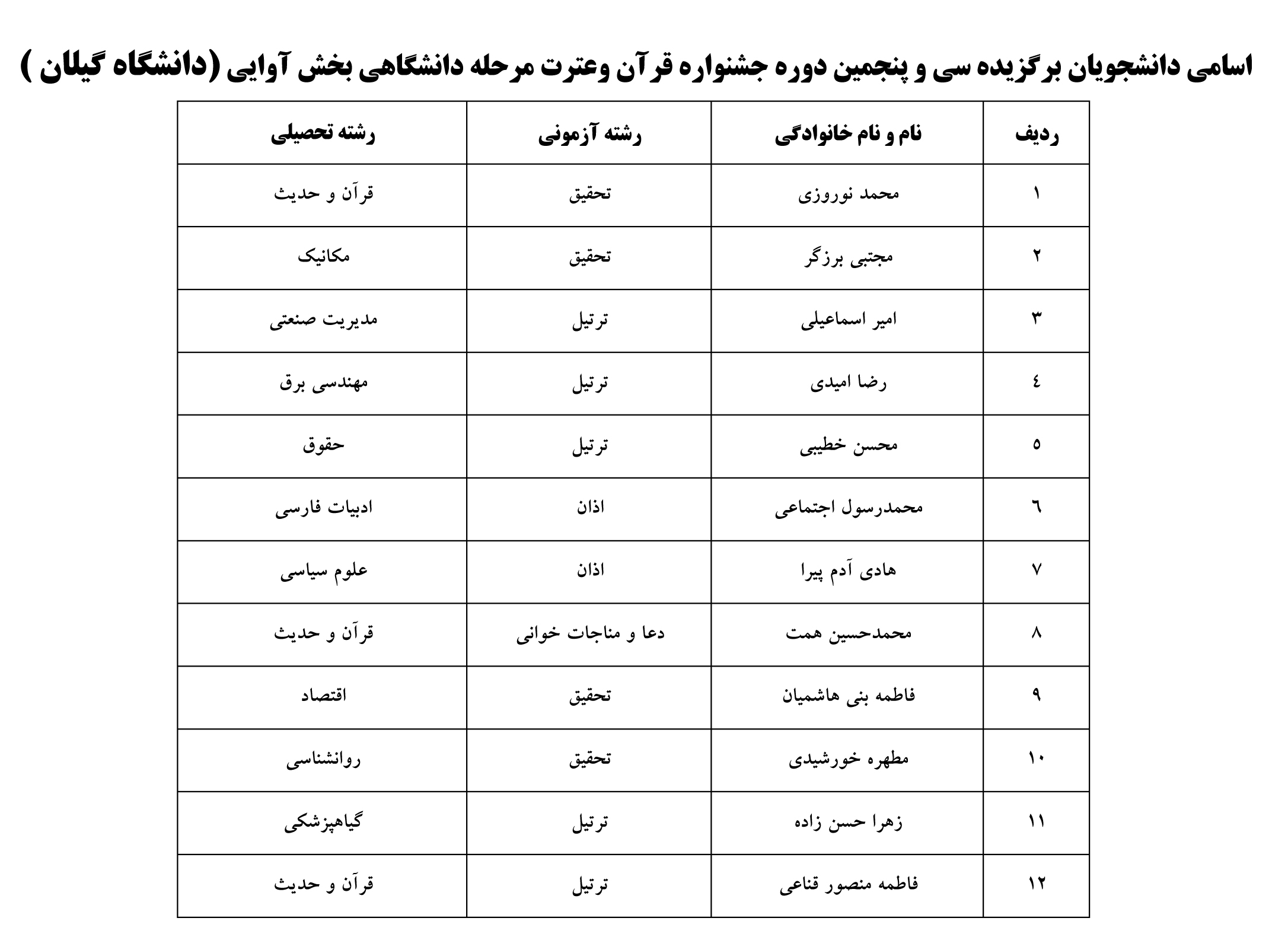 اسامی دانشجویان برگزیده سی و پنجمین دوره جشنواره قرآن وعترت مرحله دانشگاهی بخش آوایی (دانشگاه گیلان )
