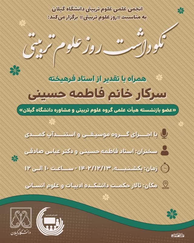 انجمن علمی علوم تربیتی دانشگاه به مناسبت نکوداشت روز علوم تربیتی، مراسم جشنی را همراه با تقدیر از سرکار خانم فاطمه حسینی دولت آبادی عضو بازنشسته هیأت علمی گروه علوم تربیتی و مشاوره دانشگاه گیلان، در تاریخ 13 اسفند ماه 1402 در تالار حکمت برگزار گردید.
