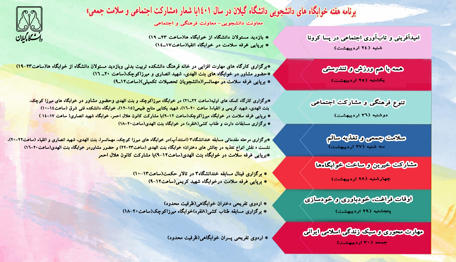 معاونت فرهنگی و اجتماعی دانشگاه با همکاری معاونت دانشجویی دانشگاه گیلان برنامه های متنوعی طی هفته خوابگاه ها در خوابگاههای دختران و پسران دانشگاه گیلان برگزار نمود.
