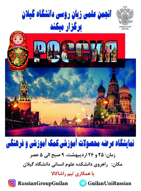 انجمن علمی زبان روسی دانشگاه گیلان، در روزهای سه شنبه و چهارشنبه مورخ ۲۵ و ۲۶ اردیبهشت،نمایشگاه محصولات آموزشی،کمک آموزشی و فرهنگی روسیه را در دانشکده انسانی از ساعت ۹صبح الی ۵ عصر برپا کرد. به دلیل محدود بودن منابع زبان روسی این برنامه مورد استقبال اساتید و دانشجویان زبان روسی و همچنین دیگر علاقمندان به این رشته شد.