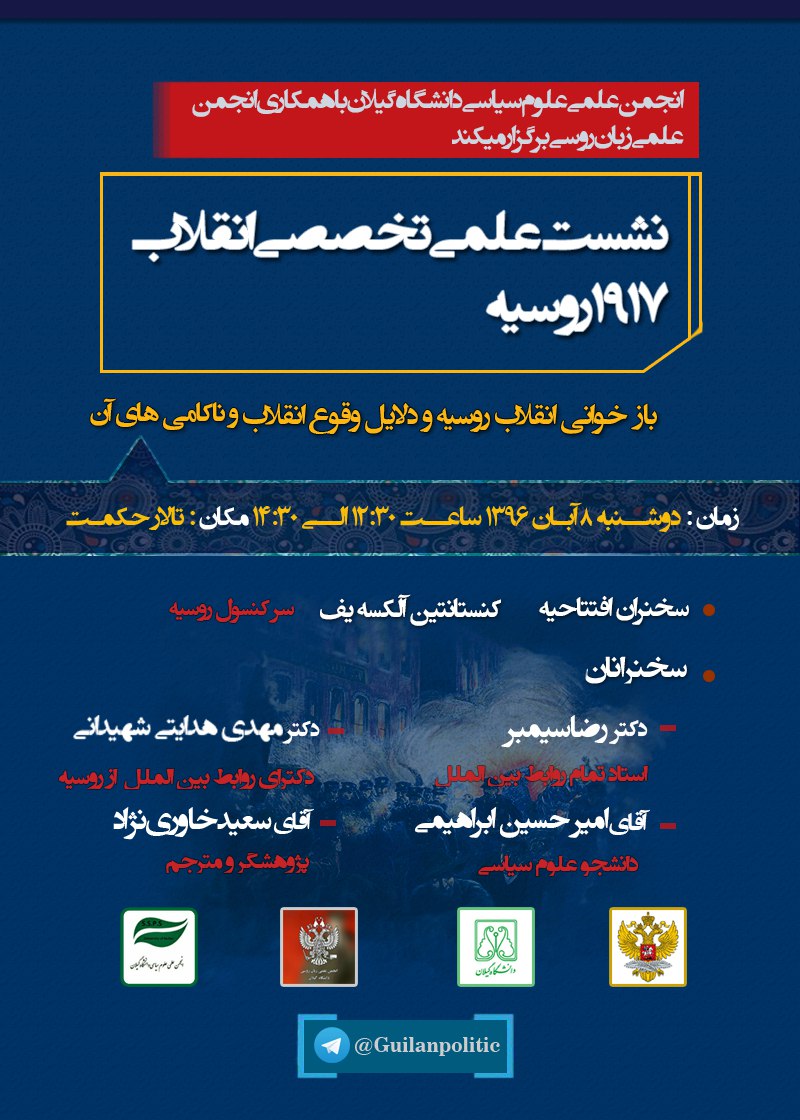 انجمن علمی علوم سیاسی دانشگاه گیلان با همکاری انجمن علمی زبان روسی دانشگاه گیلان در تاریخ ۱۳۹۶/۰۸/۰۸ (روز دوشنبه) ساعت ۱۲:۳۰ الی ۱۴:۳۰ در تالار حکمت دانشکده انسانی،نشستی علمی تخصصی در رابطه با انقلاب ۱۹۱۷ روسیه برگزار کردند. از موضوعات این نشست می توان به بازتاب ایدئولوژی و انقلاب روسیه در هنر اتحاد جماهیر شوروی، آرمان شهر مردمان روس و همراهی هویت و فرهنگ راهبردی، مشکلات پیرامون حکومت تزاری و دلایل وقوع انقلاب انقلاب اکتبر و ره آوردها و افق های فراسو اشاره کرد. سخنرانان این نشست ۱)دکتر رضا سیمبر(استاد تمام روابط بین الملل) ۲)دکتر مهدی هدایتی شهیدانی(دکترای روابط بین الملل از روسیه) ۳)امیرحسین ابراهیمی(دانشجوی علوم سیاسی دانشگاه گیلان) ۴)سعید خاوری نژاد(پژوهشگر و مترجم آثار روسی) در این برنامه اساتید و دانشجویان رشتهء علوم سیاسی و زبان روسی و سایر رشته های دانشگاه گیلان حضور داشتند.