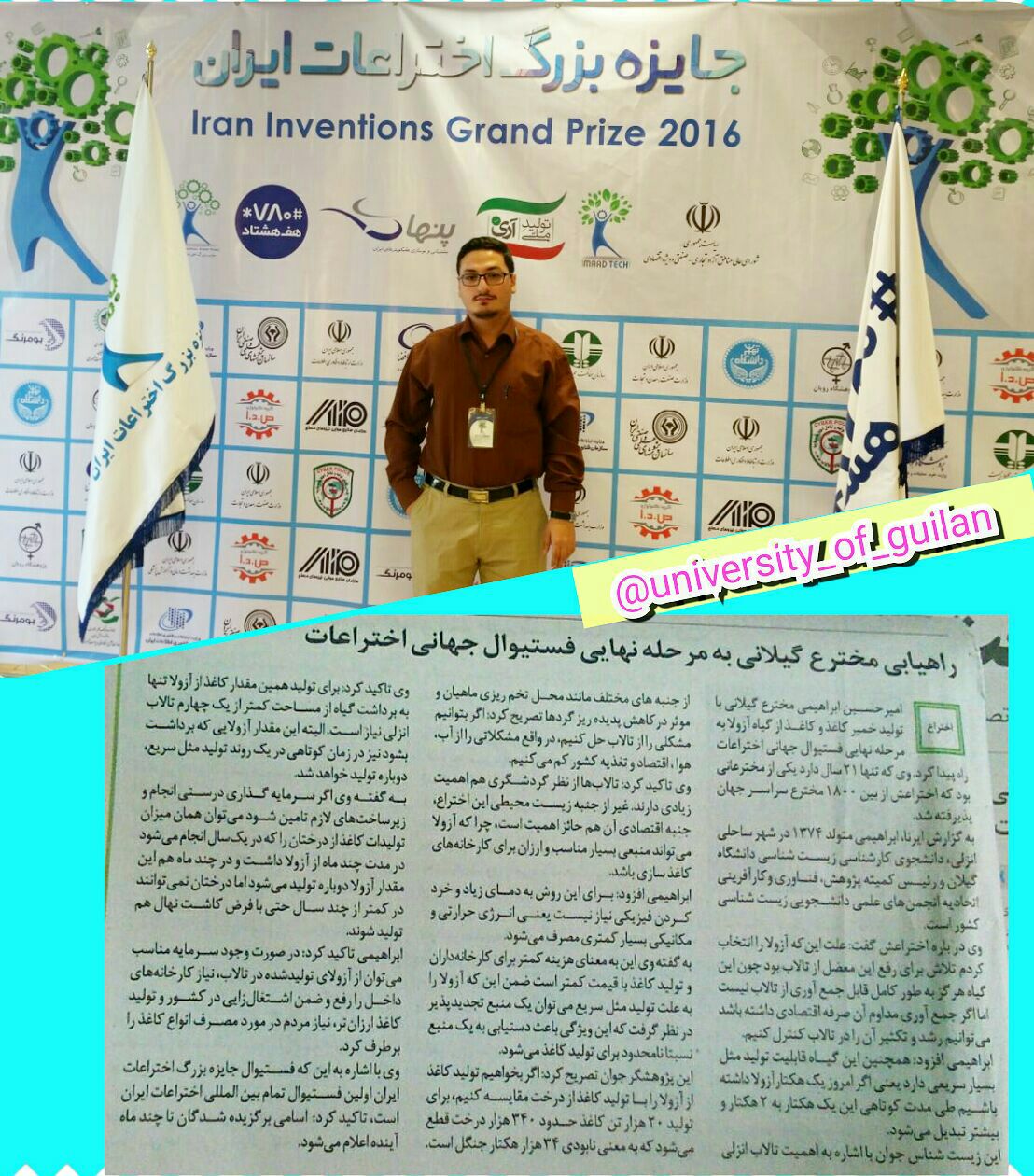 امیر حسین ابراهیمی دبیر انجمن علمی زیست شناسی دانشگاه گیلان با اختراع خمیر کاغذ و کاغذ از گیاه آزولا به به مرحله نهایی فستیوال جهانی اختراعات دست یافت.