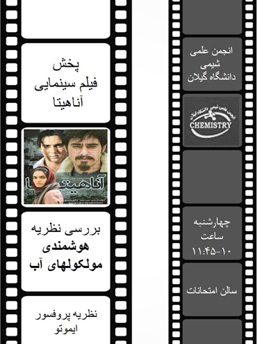 انجمن علمی دانشجویی شیمی دانشگاه گیلان جهت بررسی نظریه شهادت مولکول های آب، به جستجو و جمع آوری مطالب علمی درباره این موضوع پرداخت که به همراه پخش فیلم آناهیتا، گزارشی در قالب فایل پاورپوینت مورخ 97/2/05 در دانشکده علوم پایه برای حاضران به نمایش گذاشت. نظریه هوشمندی یا شهادت آب پروفسور ایموتو از نظریه های جنجالی علم شیمی بوده است که ادعا می کند شکل ساختاری آب وابسته به رفتار محیط اطراف است. داستان فیلم سینمایی آناهیتا برپایه مشاهدات این پروفسور است.