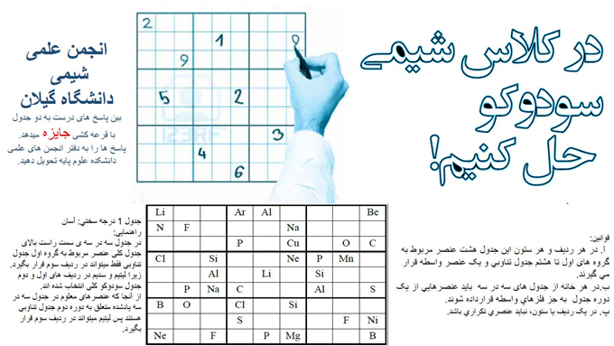 انجمن علمی دانشجویی شیمی دانشگاه گیلان مسابقه سودوکو  شیمی را اردیبهشت ماه 97 برگزار نمود.  این انجمن علمی، جداول سودوکویی با قوانین مشخص و با محوریت های عناصر جدول تناوبی یا ترکیبات یونی در اختیار داشت؛ که با تکثیر آن جداول و قوانین آن و اشتراک گذاری فرم جدول فراخوان شرکت در مسابقه در شبکه های مجازی انتشار داد که از بین  فایل های دریافتی و حل های صحیح دانشجویان به قید قرعه از برگزیدگان با اهدای جایزه تقدیر گردید. قوانین تهیه شده سودوکو در شیمی عناصر: آ . در هر ردیف و هر ستون این جدول هشت عنصر مربوط به گرو ههای اول تا هشتم جدول تناوبی و یک عنصر واسطه قرار می گیرند. ب.در هر خانه از جدول های سه در سه  باید عنصرهایی از یک دوره جدول  به جز فلزهای واسطه قرارداده شوند. پ.  در یک ردیف یا ستون، نباید عنصری تکراری باشد.