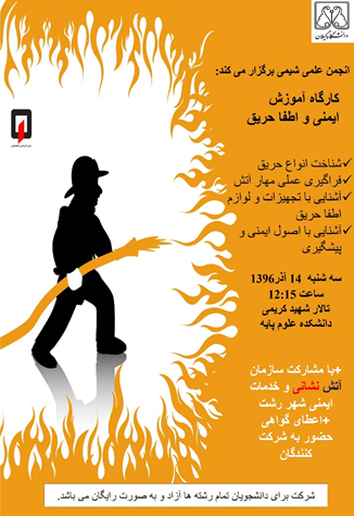 انجمن علمی دانشجویی شیمی با همکاری اداره آتش نشانی رشت،کارگاه آموزش ایمنی و اطفا حریق را مورخ 14 آذر ماه 96 با حضور مدرس مجرب اداره آتش نشانی ,آقای نوروزی و اکیپ کامل آتش نشانی با خودرو، لوازم و متخصصین اطفای حریق در دو بخش تشریح نظری مباحث ایمنی و آتش؛ در تالار شهید کریمی و همچنین آموزش عملی در محوطه دانشکده برگزار نمود. شایان ذکر است به شرکت کنندگان گواهی حضور در کارگاه اعطا شد.