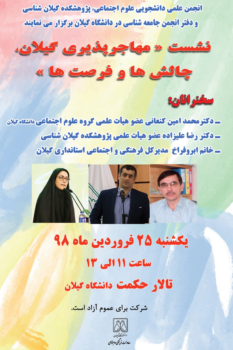 انجمن علمی دانشجویی علوم اجتماعی، پژوهشکده گیلان شناسی با همکاری دفتر انجمن جامعه شناسی در دانشگاه گیلان  نشست « مهاجرپذیری گیلان، چالش ها و فرصت ها » را در دانشگاه گیلان برگزار می نمایند.