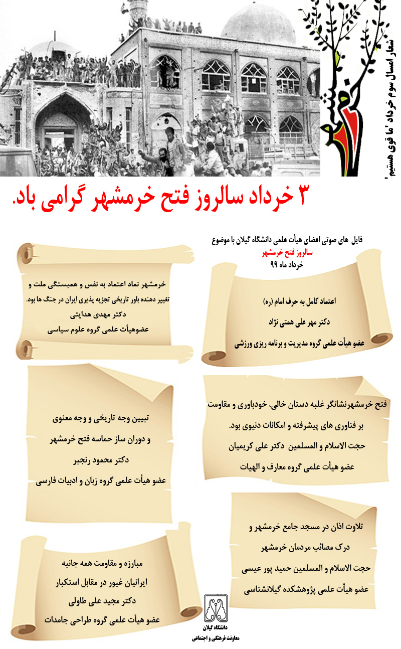 معاونت فرهنگی و اجتماعی دانشگاه گیلان به مناسبت سالروز فتح خرمشهر، برنامه ای در قالب فایل های صوتی 5 دقیقه ای از اعضای هیأت علمی دانشگاه با موضوع مرتبط تهیه و تنظیم نموده که در خرداد ماه از طریق شبکه اجتماعی معاونت فرهنگی و اجتماعی دانشگاه گیلان ( fguilan@ ) منتشر می گردد.