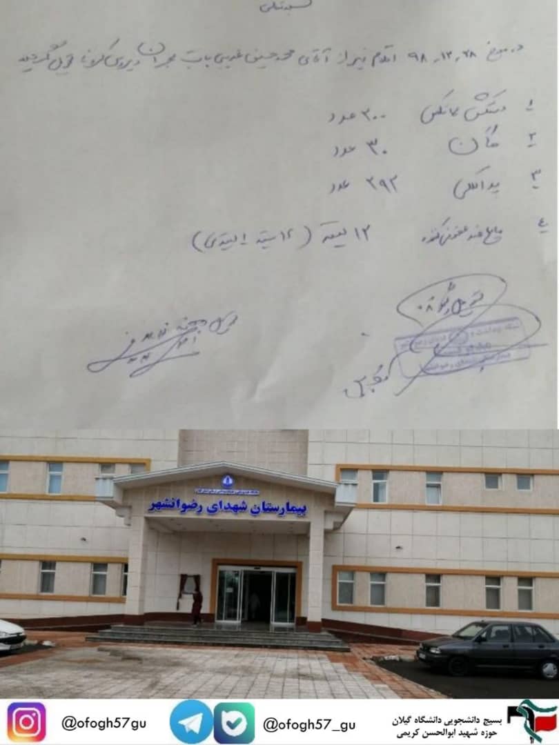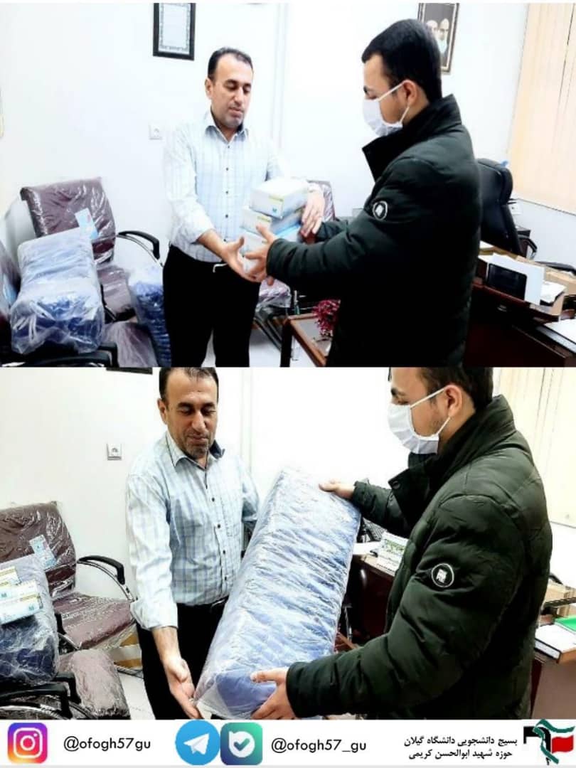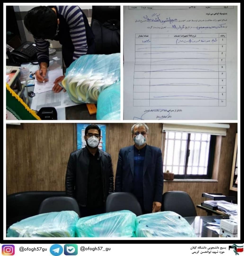 ـ اهدای 48 عدد گان ، 100 جفت دستکش، 100 عدد ماسک طبی مخصوص، 100 عدد ماسک تولید کارگاه و 100 عدد شیلد، به بیمارستان شفا رشت