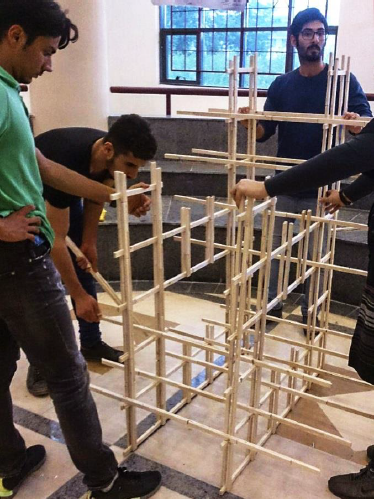 هدف از برگزاری این کارگاه، ارتقای دانش و مهارت دانشجویان برای ساخت سازه های چوبی و همچنین فرآیند صنعتی تولیدات چوبی بود. ابتدا، سمینار آموزشی جهت شرح موضوع کارگاه، آشنایی با اتصالات، نحوه ی طراحی سازه های چوب (در قالب مدل سازی) و معرفی نمونه های موردی برگزار گردید. همچنین برای اینکه طرح های دانشجویان فراتر از امکانات دانشگاه نباشد، محدودیت هایی نظیر مقدار چوب موجود، معرفی ابزار های کار، محدودیت طول هر مدل برای هر یک از مقاطع موجود و... اعمال شد. پس از سمینار، 6 روز فرصت طراحی جهت ارائه ی مدارک خواسته شده به دانشجویان داده شد. بعد از آن آثار دانشجویان داوری شد و به نفرات اول و دوم جایزه تعلق گرفت. در روز بعد نفر اول با نظر مدرس کارگاه طرح خود را اصلاح و آماده ی اجرا نمود. در پروسه ی  1 روزه  اصلاحات و توسعه سعی شد با حفظ ژن اصلی طرح، مواردی نظیر ایستایی و زیبایی شناسی سازه آموزش داده شد. همچنین قرار شد، نفر برگزیده با نظارت مدرس کارگاه، اجرای طرح خود را پیش ببرد. روند تکامل طرح روند اجرا به این صورت بود که در روز اول تعداد قطعات محاسبه و با اره دستی برش داده شد. سپس مدول های مورد نیاز با چسب چوب به هم متصل و با چسب کاغذی به هم پرس شدند. پس از گذشت 1 روز چسب چوب خشک شد و روند ساخت آغاز گردید. برای ساخت سازه چوبی لایه های موازی با نما، از یک جهت ساخته شدند. سپس هر کدام در جای خود قرار گرفتند . پس قرار گرفتن لایه ها در جای خود، دانشجویان شروع به سمباده زدن گوشه های تیز چوب ها برای ظریف تر شدن ظاهر اثر کردند. در نهایت گلدان­ها  در جای خود قرار گرفتند و کار ساخت به اتمام رسید.