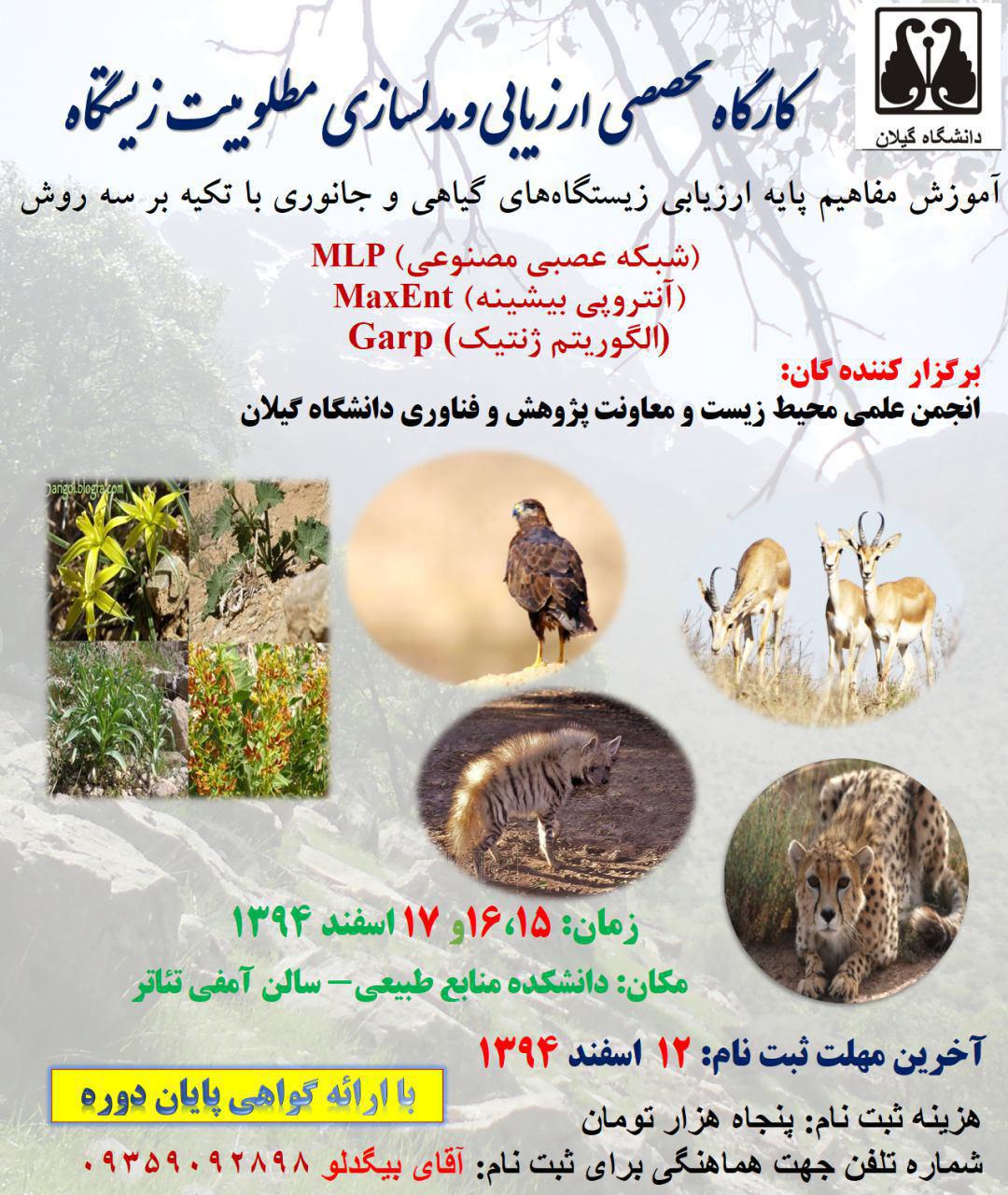 کارگاه مدل سازی، در روزهای سه شنبه و چهارشنبه و پنج شنبه از ساعت 3 الی 8 در آزمایشگاه سنجش از دور دانشکده منابع طبیعی، با حضور دانشجویان ثبت نام کننده، برگزار گردید. در این کارگاه آقای مهندس پیمان کرمی، در رابطه با روش های مدلسازی و ارزیابی زیستگاه با استفاده از روش های مکسنت و شبکه عصبی و الگوریتم ژنتیک، و  همچنین در رابطه با تئوری مدل ها، توضیحاتی در قالب پاور پوینت ارائه نمودند. در نهایت در رابطه با مفاهیم اصلی در رشته محیط زیست همچون مطلوبیت زیستگاه، نحوه انتخاب نمونه، نحوه انتخاب منطقه مورد مطالعه و نحوه استفاده و کاربرد مدل های حاضر در ارتباط با محیط زیست توضیحات کامل و جامع ارائه گردید. علاوه بر این جلسه پرسش و پاسخ و رفع اشکالات نیز برگزار شد.
