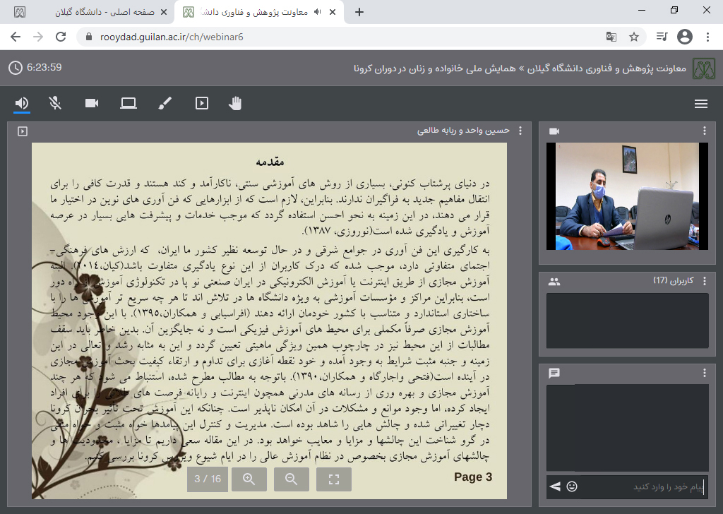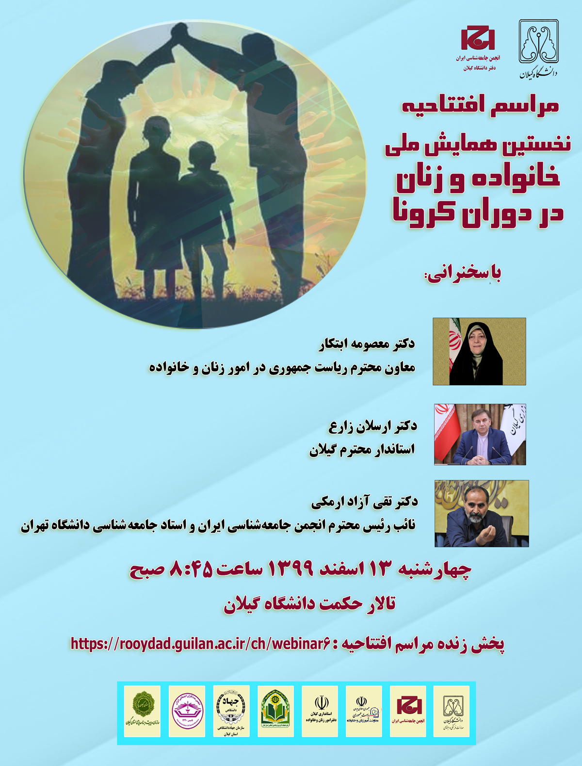 نخستین همایش ملی «خانواده و زنان در دوران کرونا» با همکاری دانشگاه گیلان، انجمن جامعه شناسی ایران، معاونت امور زنان و خانواده نهاد ریاست جمهوری، سازمان جهاد دانشگاهی گیلان، استانداری گیلان و فرمانده انتظامی گیلان در تالار حکمت دانشگاه گیلان برگزار شد.