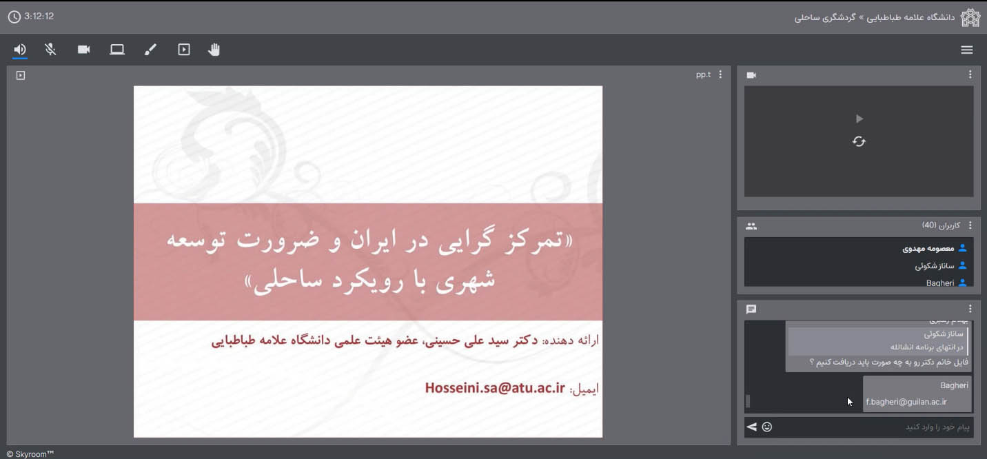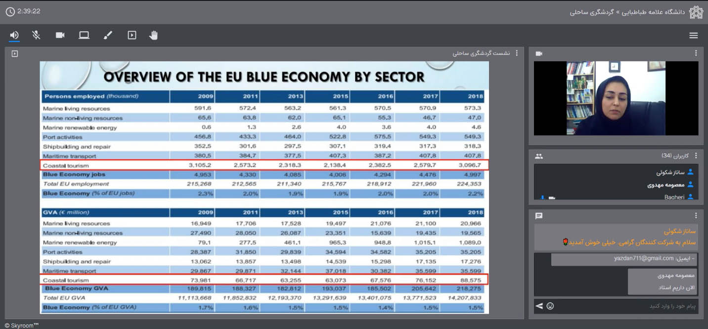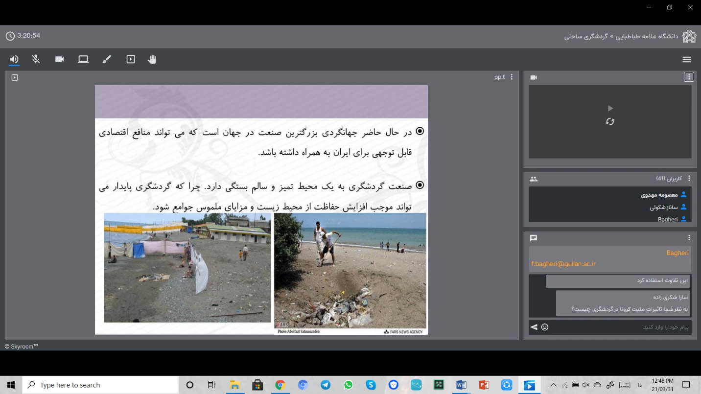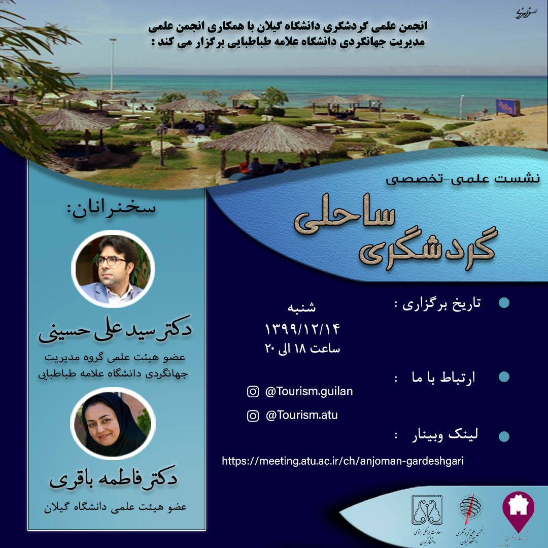 نشست علمی- تخصصی گردشگری ساحلی در تاریخ 14 اسفند ماه 1399 از ساعت 18 الی 20 با حضور علاقه مندان به این حوزه در فضای مجازی اسکای روم توسط انجمن علمی گردشگری دانشگاه گیلان و با همکاری انجمن علمی مدیریت جهانگردی دانشگاه علامه طباطبایی تهران برگزار گردید.