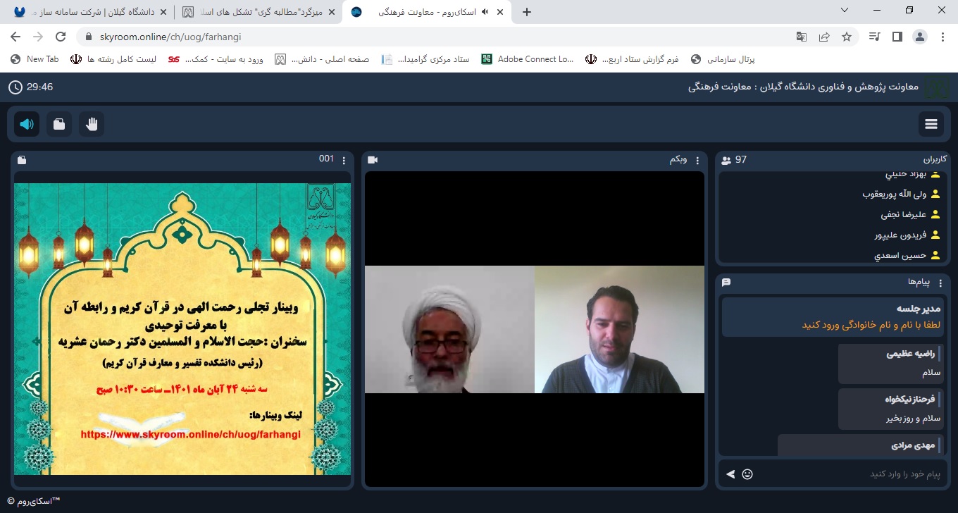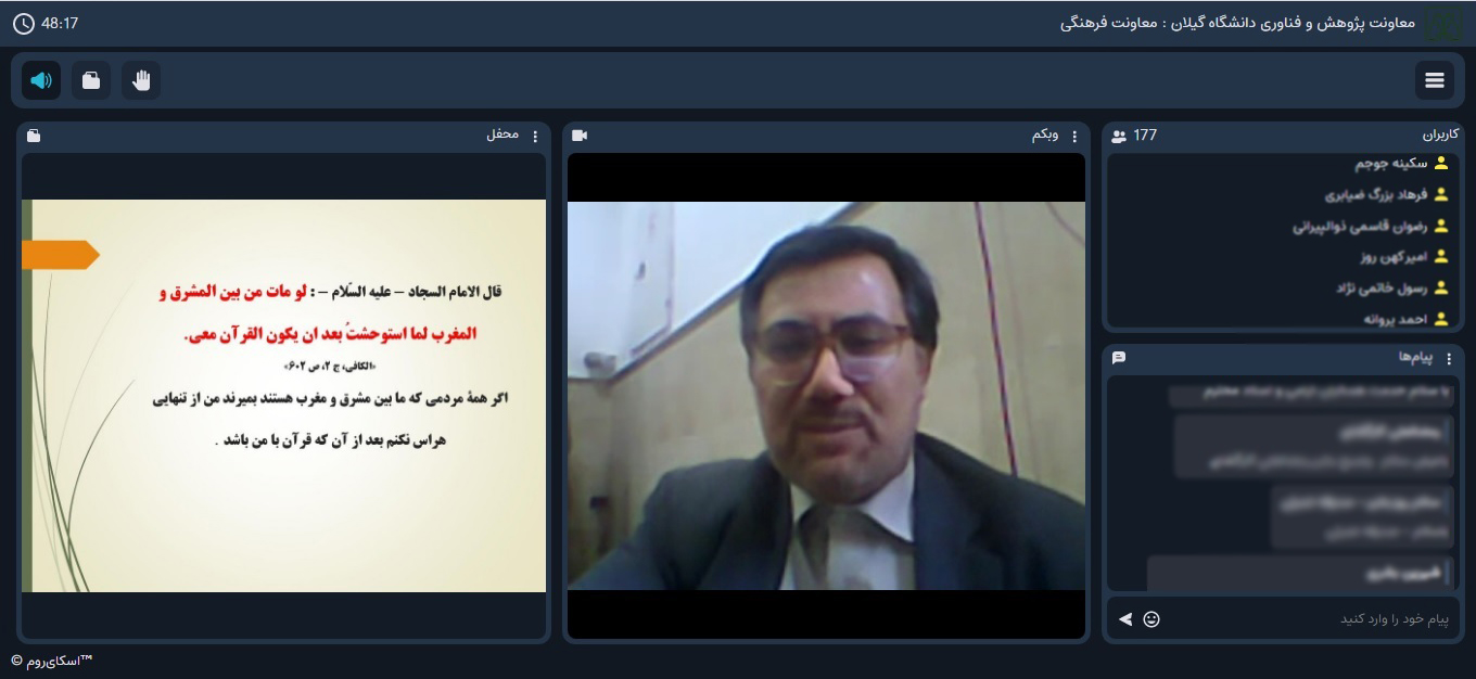 به مناسبت گرامی داشت هفته قرآنی دانشگاهیان وبینار"اصول زیبا خوانی قرآن کریم" با حضور قاری بین المللی استاد علی اصغر شعاعی روز دوشنبه 23 آبان برگزارشد و نیز وبینار "تجلی رحمت الهی در قرآن کریم و رابطه آن با معرفت توحیدی" با حضور حجت الاسلام و المسلمین دکتر رحمان عشریه (رئیس دانشکده تفسیر و معارف قرآن کریم) 24 آبان با استقبال همکاران دانشگاه گیلان برگزار گردید.