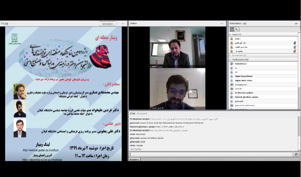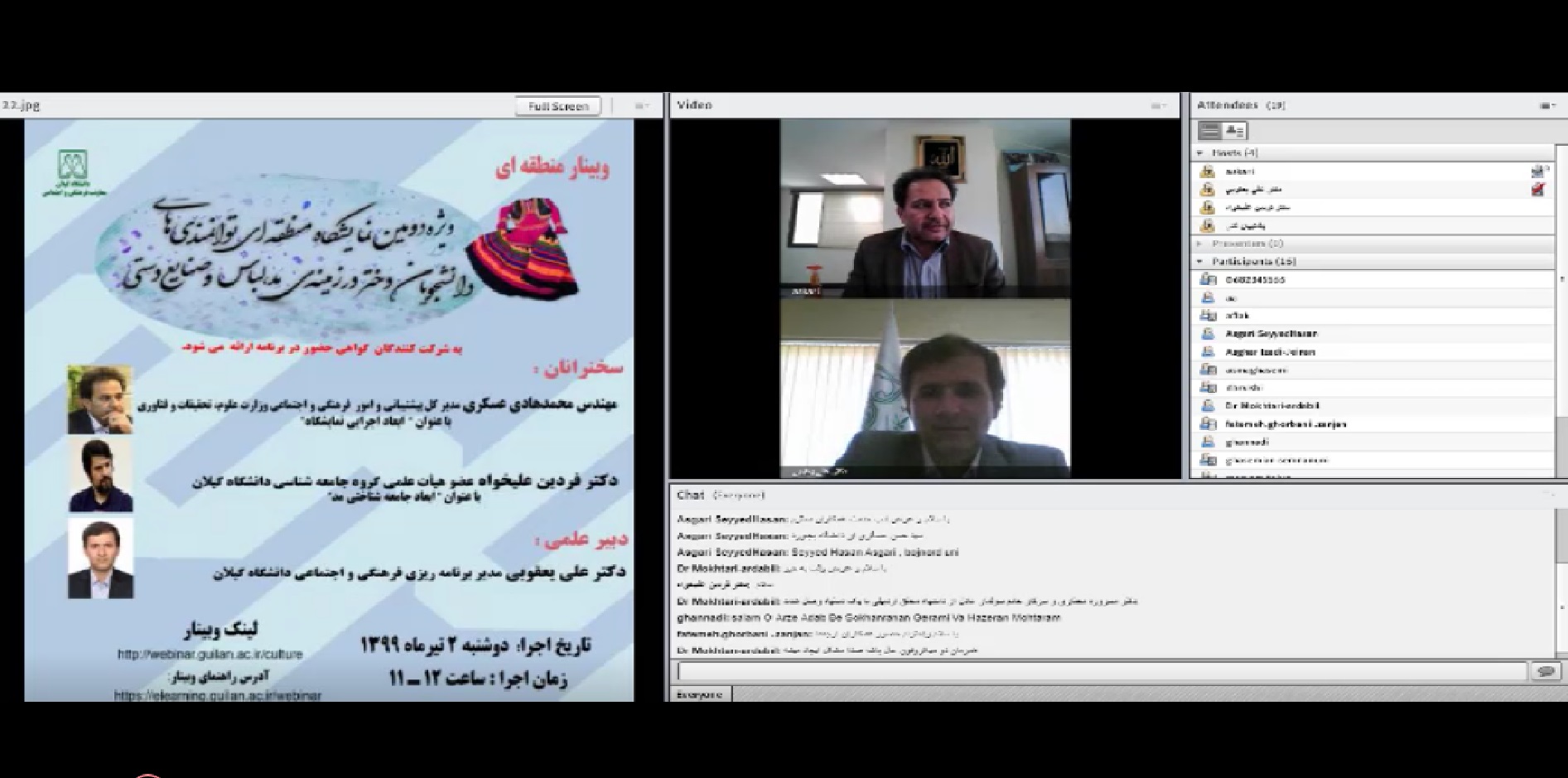به همت معاونت فرهنگی و اجتماعی دانشگاه و با همکاری مرکز فناوری اطلاعات و ارتباطات دانشگاه گیلان وبینار ویژه دومین نمایشگاه منطقه ای توانمندی های دانشجویان دختر در زمینه مد، لباس و صنایع دستی به صورت آنلاین برگزار گردید.