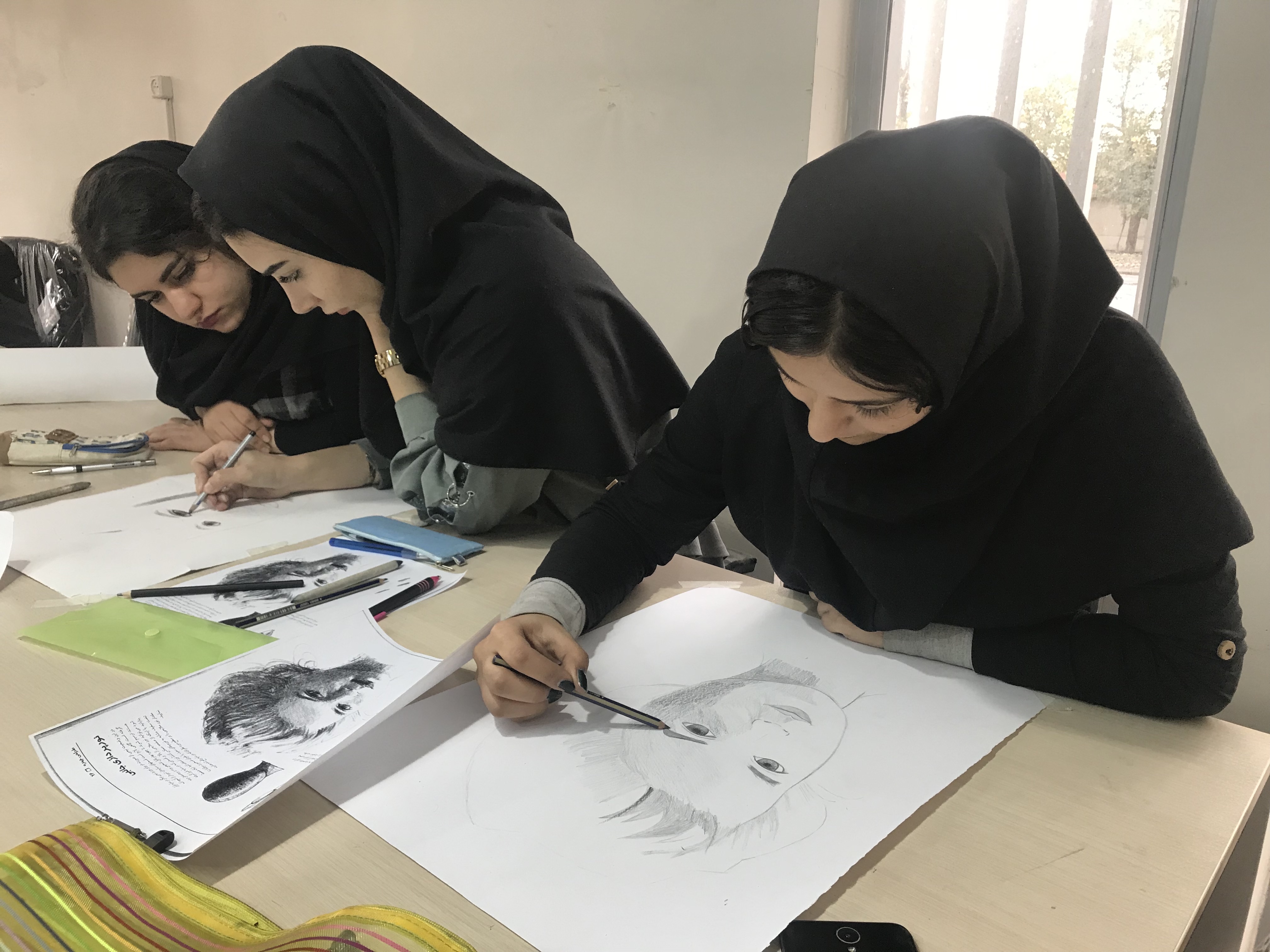 جلسه دوم : پس از آنکه دانشجویان بااستفاده از مداد ورسم خطوط دستان خود راگرم کردند، بااستفاده از کتاب طراحی چهره پائول لویل ، چگونه سایه زدن چهره بامداد به آنها آموزش داده شد و از هنرجویان خواسته شد به دلخواه خود ، طرح تمام رخ با نظارت مدرس، انتخاب کنند و به طراحی آن بپردازند و در پایان تعدادی طرح برای تمرین درمنزل داده شد.