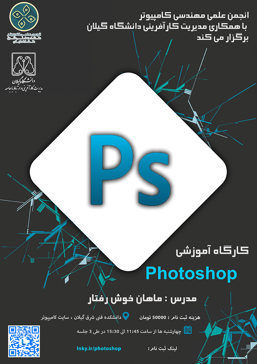 انجمن علمی دانشجویی مهندسی کامپیوتر فنی شرق گیلان، کارگاه آموزشی فتوشاپ به منظور توانایی دانشجویان در طراحی های گرافیکی ، ویرایش تصاویر، و طراحی پوستر 18 اردیبهشت 98 الی 1 خرداد 98  برگزار نمود.  ماهان خوش رفتار مدرس کارگاه بود که 29 نفر  از دانشجویان در آن شرکت نمودند.