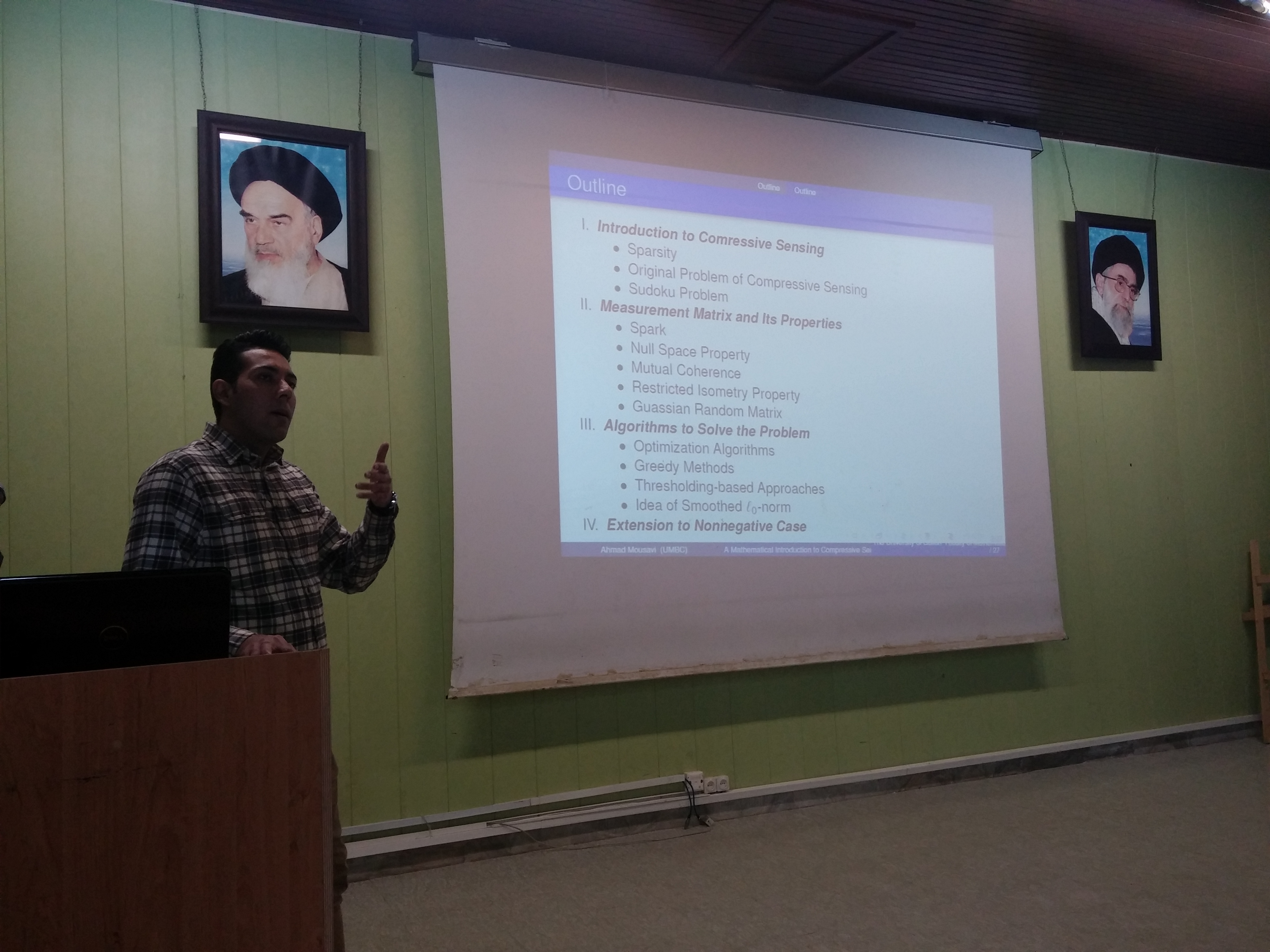 در طی این برنامه که با حضور اساتید دانشکده ریاضی، آقای احمد موسوی دانشجوی دکتری ریاضی دانشگاه مریلند امریکا به ایراد سخنرانی خود در مورد «حسگری فشرده» یک زمینه علمی مرتبط با صنعت برق و کامپیوتر و علوم ریاضی و علوم ریاضی و کاربردهای آن در علوم مختلف علمی پرداختند.
