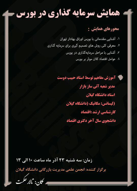 انجمن علمی مدیریت بازرگانی دانشگاه گیلان در تاریخ 95/09/23 همایش سرمایه گذاری در بورس در تالار حکمت از ساعت 10 الی 13 برگزار نمود. این همایش توسط امیر حبیب دوست، دانشجوی سال آخر دکتری اقتصاد از دانشگاه مازندران، و دارنده لیسانس مکانیک از دانشگاه گیلان به مدت 3 ساعت ارائه گردید. هدف از این همایش موارد زیر بود که تحقق یافت. 1-آشنایی مقدماتی با بورس اوراق بهادار تهران 2-معرفی کلی روش های تصمیم گیری برای سرمایه گذاری 3-آشنایی با مراحل سرمایه گذاری در بورس 4-عوامل اقتصاد کلان موثر بر بورس
