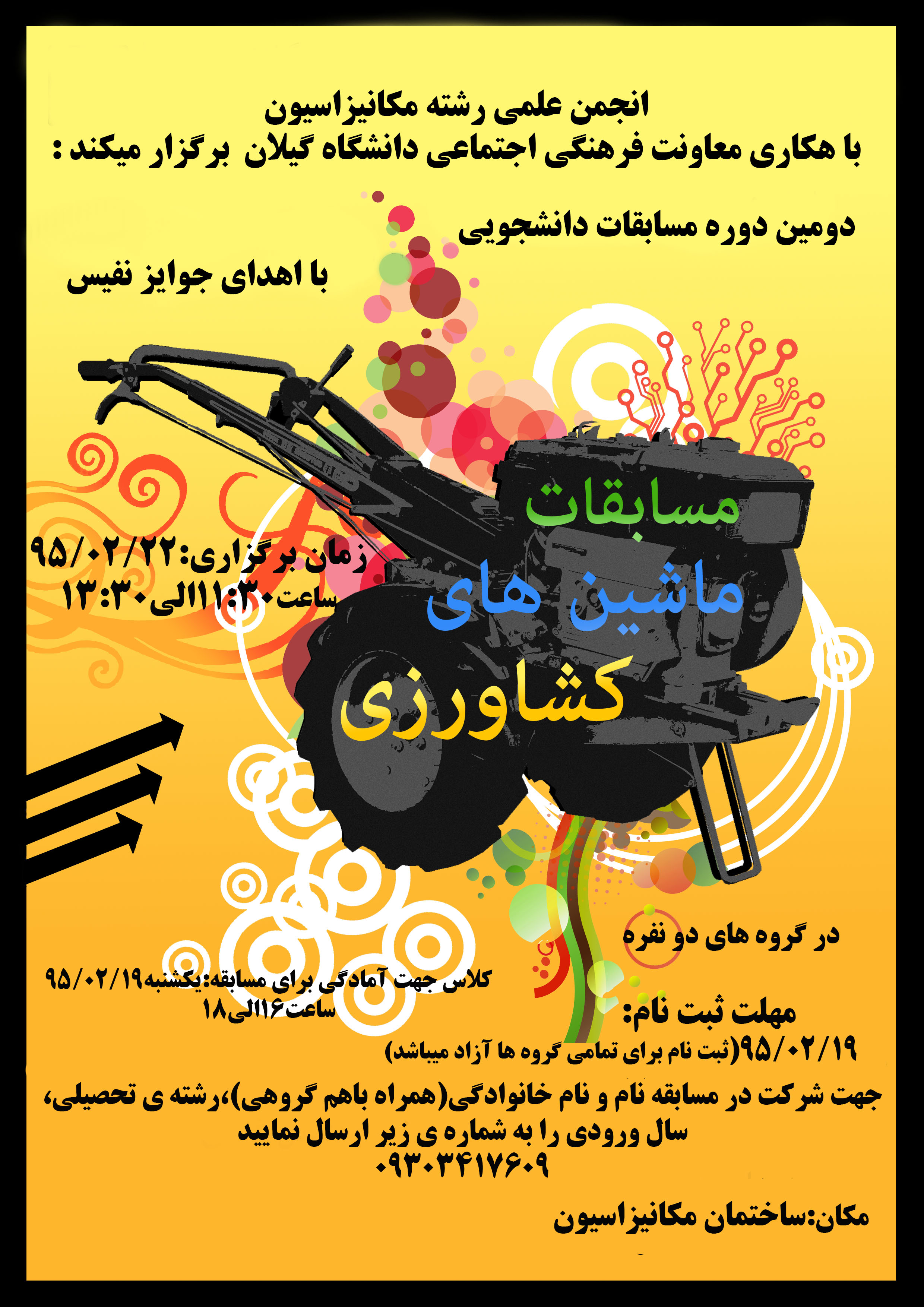 جلسه معارفه گروه مکانیزاسیون کشاورزی ورودی ۹۶ دانشگاه گیلان مورخ 10 آبان ماه در دانشکده علوم کشاورزی برگزار گردید. در این برنامه که با تلاش انجمن علمی دانشجویی گروه مکانیزاسیون کشاورزی برگزار شد، مدیر گروه مکانیزاسیون کشاورزی، اعضای هیت علمی گروه، ، دبیر انجمن علمی مکانیزاسیون سخنرانی نمودند.  پخش کلیپ معرفی رشته مکانیزاسیون(ساخته شده توسط اعضای انجمن)، پخش مصاحبه گرفته شده از دانشجویان ورودی 96پخش کلیپ مسابقه ماشین های کشاورزی انجام شده در سال گذشته، اجرای بخش طنز به صورت زنده، قرعه کشی و اهدای جوایز ، بسته های حاوی بروشور های معرفی رشته و پذیرایی از دیگر بخشهای این برنامه بودند.