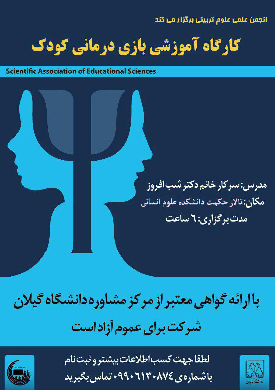 انجمن علمی دانشجویی علوم تربیتی دانشگاه گیلان کارگاه آموزشی بازی درمانی کودک را با هدف آشنایی دانشجویان رشته های مرتبط روانشناسی و علوم تربیتی با روش درمانی روانشناسانه و علمی بازی درمانی برای کودکان و آشنایی با متد گل درمانی و بادکنک درمانی برای کودکان جهت رفع و درمان مشکلات خلقی و رفتاری شان، با تدریس خانم دکتر شب افروز عضو هیئت علمی دانشگاه پیام نور در تاریخ 8 و 23 اردیبهشت ماه 97 طی 2جلسه ی 3ساعته برگزار نمود.