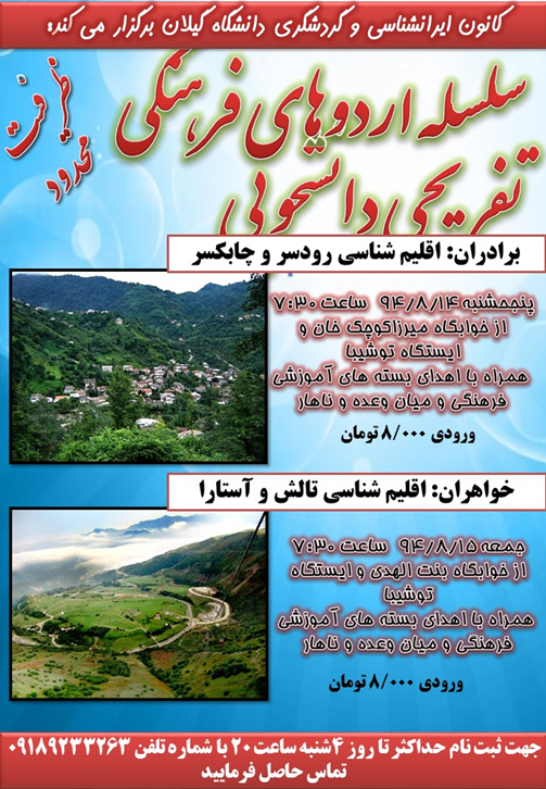 این طرح در روز جمعه مورخ 15 آبان ماه 94 با حضور جمعی از دانشجویان و اعضای کانون انجام شد، در این اردوی یکروزه که از ساعت 7:30 صبح   آغاز گردید از دانشکده تربیت بدنی دانشگاه  به مقصد تالش-آستارا حرکت کرده و در شهر آستارا  پس از یک نشست هم اندیشی پیرامون اقلیم شناسی این شهر  و صرف ناهار ،  از بازار سنتی بازدید به عمل آمد. سپس در بخش دوم سفر و عزیمت به شهر تالش شد ضمن برپایی  یک نشست اقلیم شناسی 30 دقیقه ای  از بخش های مختلف این شهر زیبا از جمله سورتمه تالش و بازار محلی نیر بازدید شد.