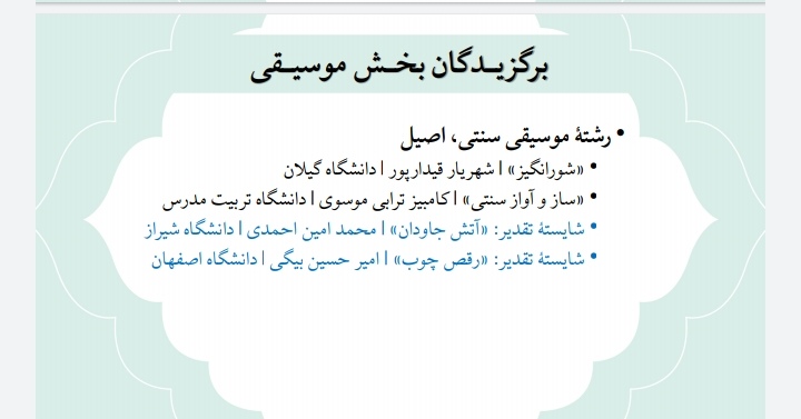 گفتنی است، آثار ارسالی دوکانون موسیقی و فیلم وعکس دانشگاه گیلان به این جشنواره عنوان برتر دردو بخش موسیقی و فیلم را کسب کردند.