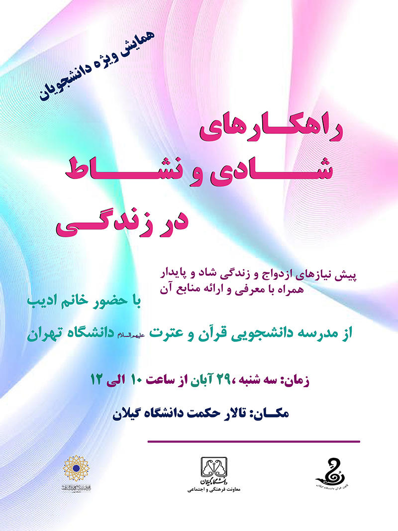 همایش شادی و نشاط در زندگی، پیش نیازهای ازدواج و زندگی شاد و پایدار با سخنرانی خانم مریم ادیب از مدرسه قرآن و حدیث دانشگاه تهران با همکاری کانون قرآن و معارف اسلامی دانشگاه گیلان در تاریخ 29 آبان ماه 97 در تالار حکمت دانشگاه برگزار شد. خانم مریم ادیب ضمن تعریف شادی سرور مناسب و خوب در باب موضوعاتی همچون وارهی از مشکلات، آداب و شرایط شادی، پرهیز از گناه و شادی به اطاعت از خداوند و ضرورت و عوامل شادی مناسب در زندگی، بعد و قبل ازدواج پرداخت.