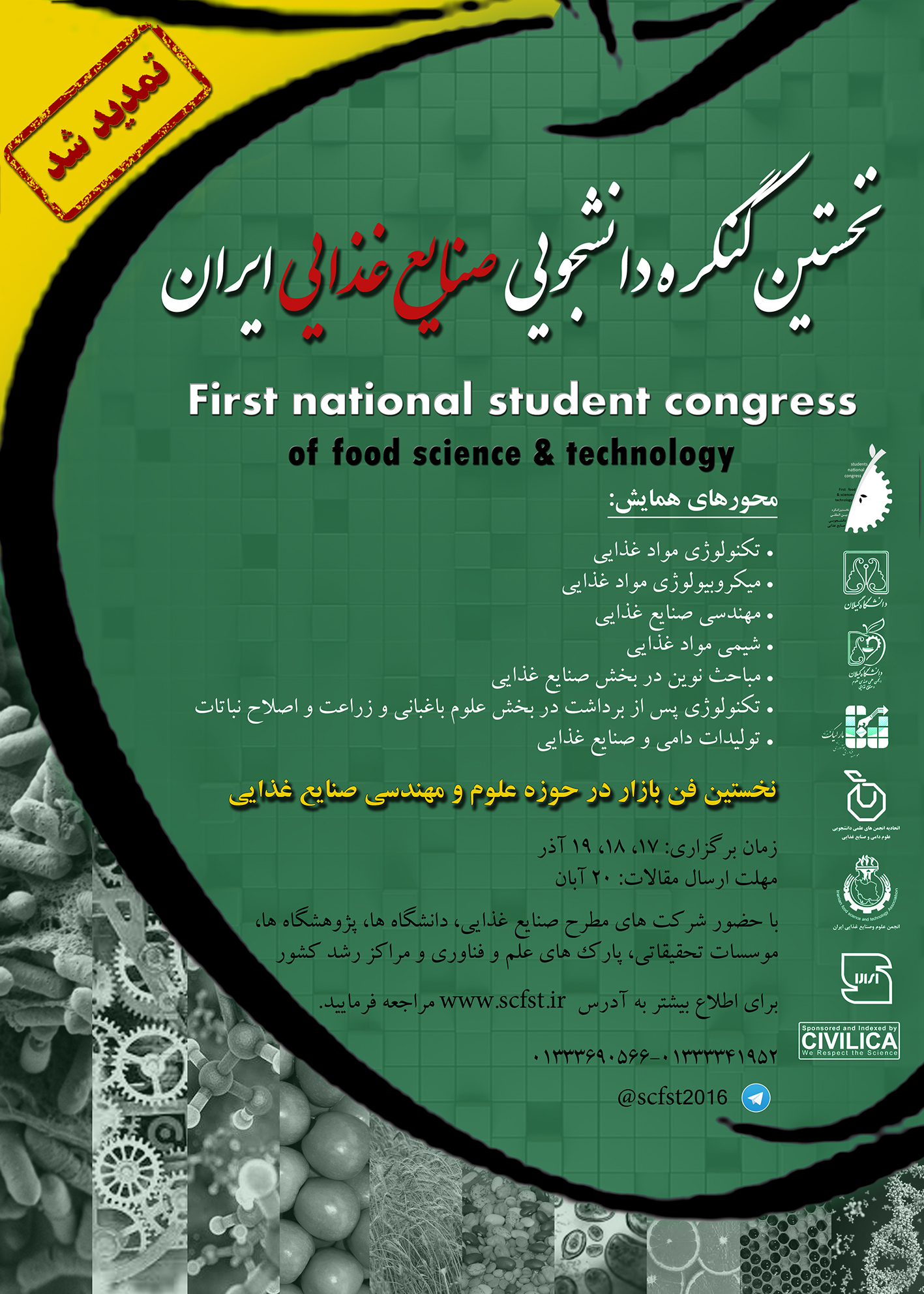انجمن علمی دانشجویی علوم صنایع غذایی دانشگاه گیلان با حمایت معاونت فرهنگی و اجتماعی دانشگاه نخستین کنگره دانشجویی صنایع غذایی ایران در 17 اسفند ماه 1395 به میزبانی دانشگاه گیلان برگزار می نماید.