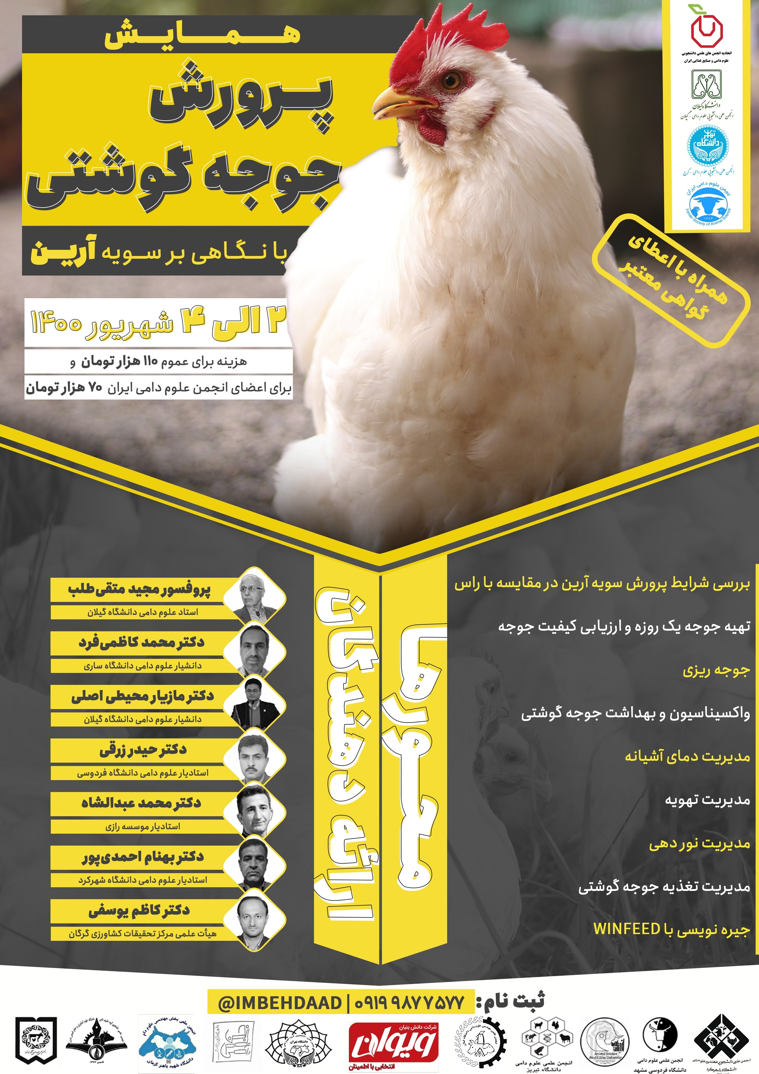 همایش سه روزه «پرورش جوجه گوشتی با نگاهی بر سویه آرین» توسط اتحادیه انجمن های علمی دانشجویی علوم دامی و صنایع غذایی کشور، انجمن علمی دانشجویی علوم دامی دانشگاه گیلان و انجمن علمی دانشجویی علوم دامی دانشگاه تهران به صورت مجازی از تاریخ 2 الی 5 شهریور 1400 برگزار شد.