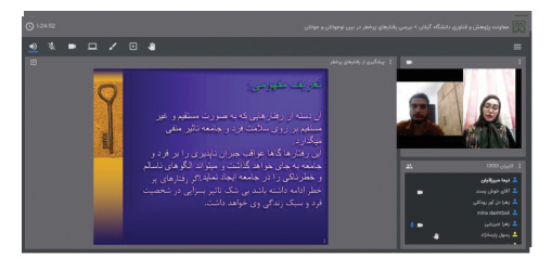 ششمین قسمت از سلسله وبینارهای پناهی برای باران با موضوع «بررسی رفتارهای پر خطر در بین نوجوانان و جوانان» توسط کانون آسیبهای اجتماعی دانشگاه گیلان در فضای اسکای روم و اینستاگرام برگزار شد. این وبینار29 مهر ماه با حضور دکتر مینا دشتبالی (مددکار اجتماعی کودک و نوجوان) و خانم زهرا جیریایی (مشاور و مدرس دورههای تخصصی پیشگیری از آسیبهای اجتماعی) به عنوان مدرس، و آروین خوش پسند (دانشجوی روانشناسی و دبیر کانون آسیبهای اجتماعی دانشگاه گیلان) به عنوان مجری و مدیر و با شرکت بیش از 400 نفر از دانشجویانی از دانشگاههای سراسر کشور اعم از دولتی، پیام نور، غیر انتفاعی و آزاد از دانشگاه گیلان، علامه، علوم پزشکی تهران، تهران، شاهد، فردوسی و با حضور استادان و مددکاران از نقاط مختلف ایران برگزار شد.