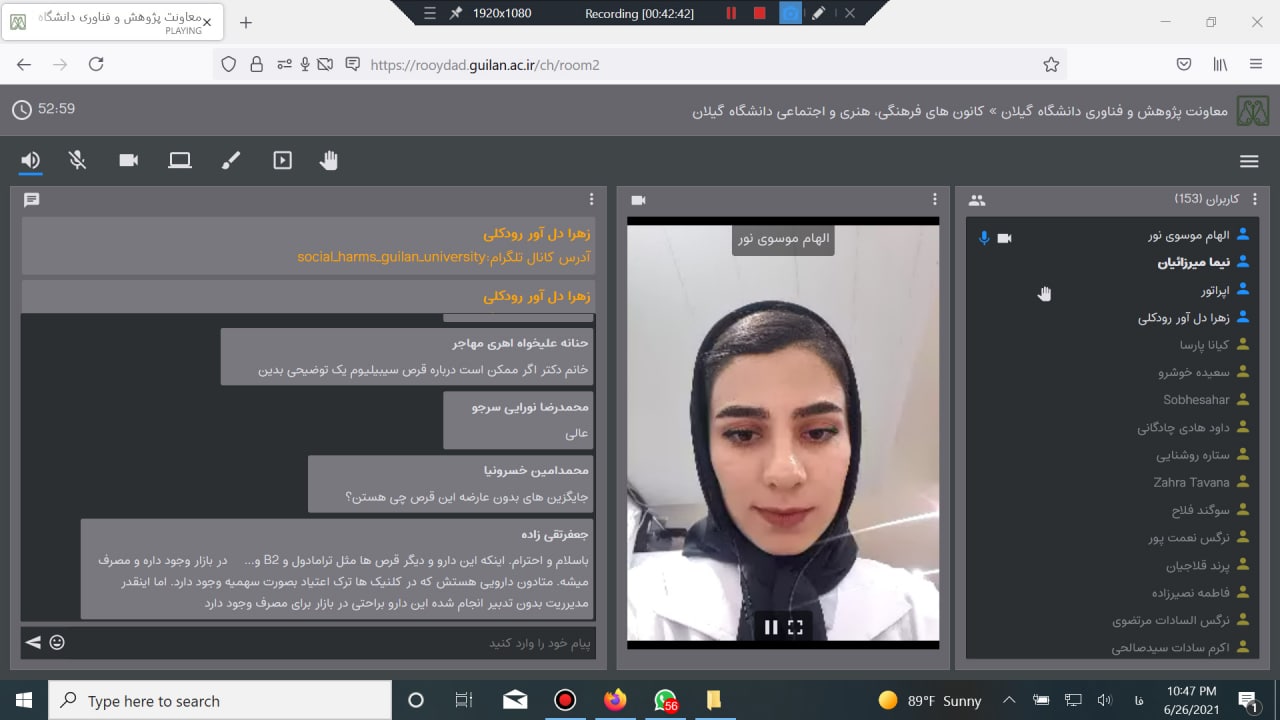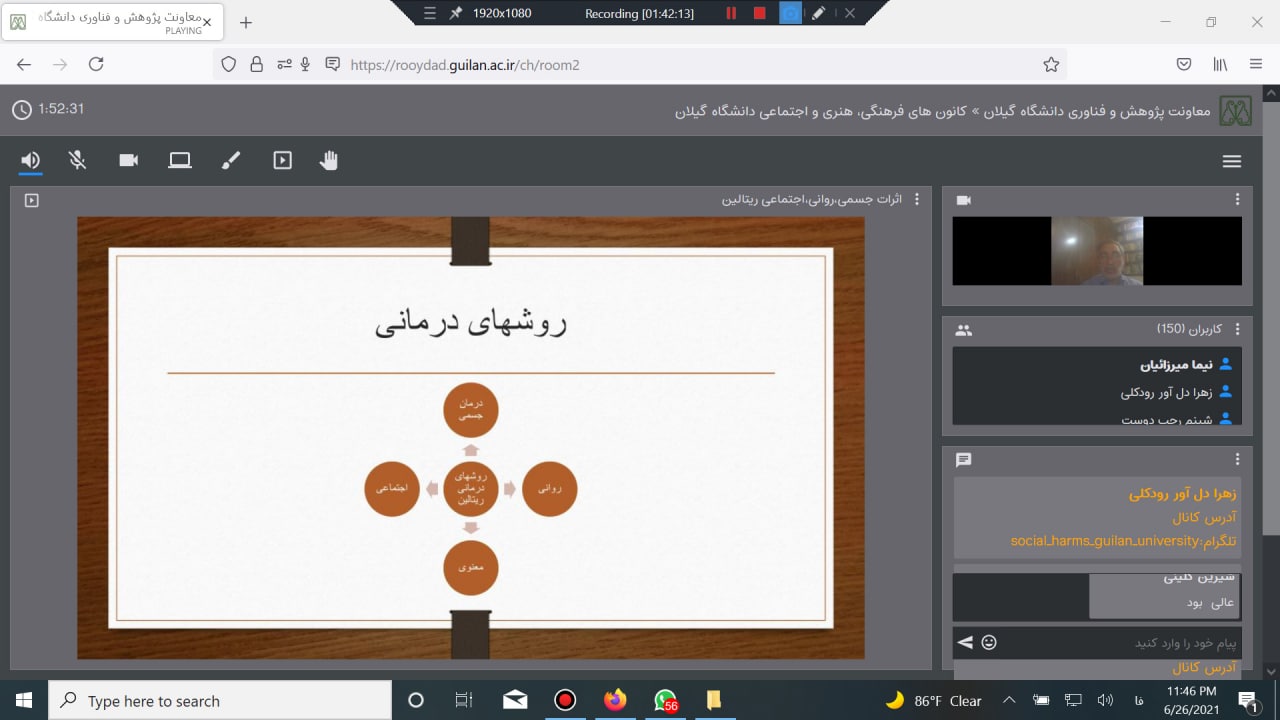 شایان ذکر است در این وبینار بیش از 150 نفر ازدانشجویان و مددکاران و اساتید از دانشگاه علوم پزشکی مشهد،دانشگاه علامه طباطبایی،دانشگاه گیلان و دانشگاه های آزاد و پیام نور و غیر انتفاعی سراسر کشور حضور داشتند.