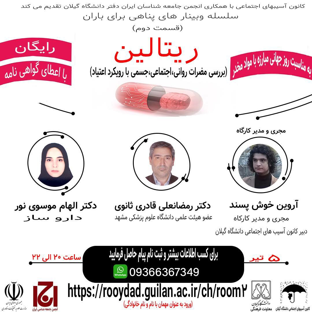 وبینار ریتالین با محوریت"بررسی مضرات روانی،اجتماعی،جسمی با رویکرد اعتیاد" توسط کانون آسیبهای اجتماعی دانشگاه گیلان با همکاری انجمن جامعه شناسی دفتر دانشگاه گیلان 5 تیر 1400 در ساعت ۲۰ الی ۲۲ در اسکای روم دانشگاه برگزار شد.