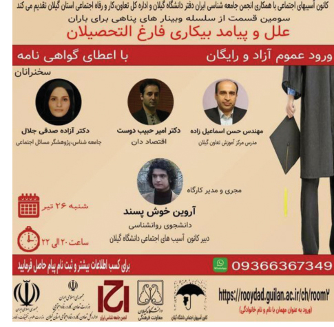 سومین قسمت از وبینار پناهی برای باران با موضوع "علل و پیامدهای بیکاری فارغ التحصیلان" توسط  کانون آسیبهای اجتماعی دانشگاه گیلان با همکاری انجمن جامعه شناسی ایران دفتر دانشگاه گیلان و اداره کل تعاون، کار و رفاه اجتماعی استان گیلان در 26 تیر ماه 1400 به صورت مجازی برگزار شد. این وبینار با حضور مهندس حسن اسماعیل زاده (مدرس مرکز آموزش تعاون گیلان) و دکتر آزاده صدقی جلال (جامعه شناس و پژوهشگر مسائل اجتماعی) به عنوان مدرس و آروین خوش پسند (دبیر کانون آسیب های اجتماعی دانشگاه گیلان) به  عنوان مجری و مدیر وبینار و با شرکت نزدیک بر200 نفر از دانشجویانی از دانشگاه های سراسر ایران ائم از دولتی، آزاد، پیام نور و غیر انتفاعی، همچنین مددکاران و استادان برگزار شد.