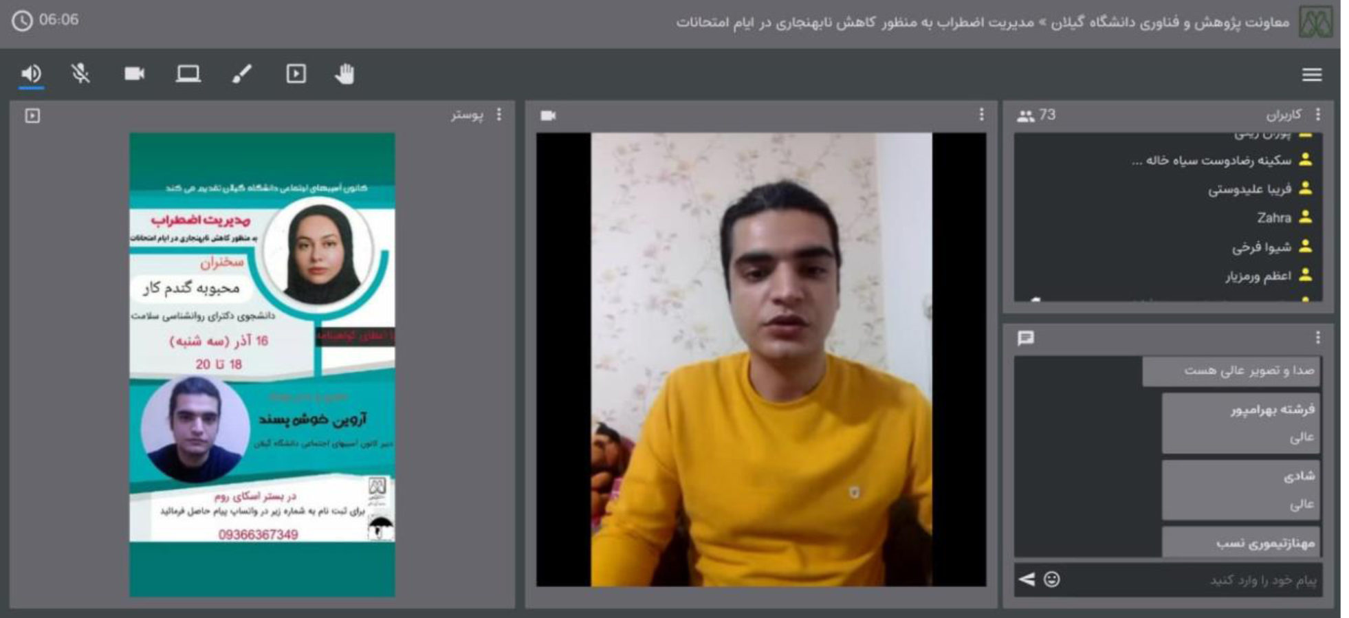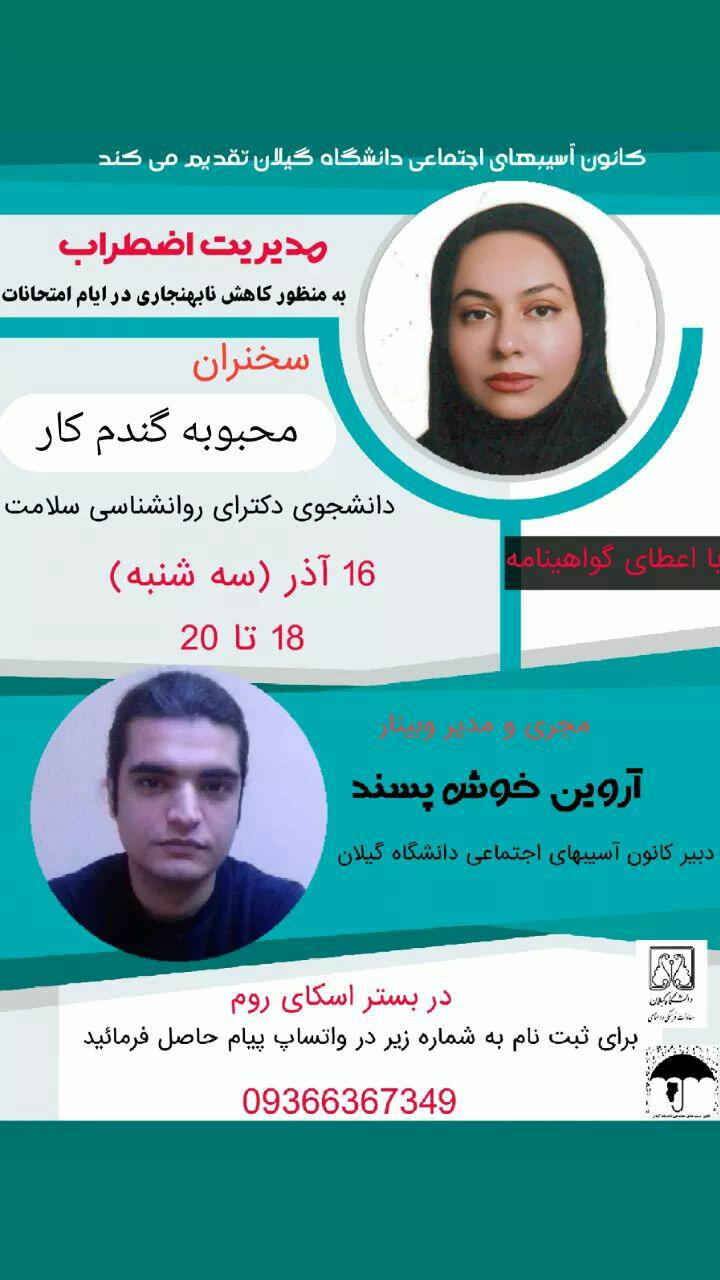 وبینار مدیریت اضطراب به منظور کاهش نابهنجاری در ایام امتحانات توسط کانون آسیبهای اجتماعی دانشگاه گیلان در تاریخ 16 آذر برگرار گردید در این وبینار آموزشی، خانم محبوبه گندمکار (دانشجوی دکترای روا نشناسی سلامت) به عنوان مدرس، و آروین خو ش پسند (دانش آموخته روا نشناس ی و دبیر کانون آسیبهای اجتماعی دانشگاه گیلان )به عنوان مجری و مدیر وبینار با حضور بالغ بر ۲۰۰ نفرشرکت کننده و استادان و مددکارانی از سراسر ایران حضور داشتند.