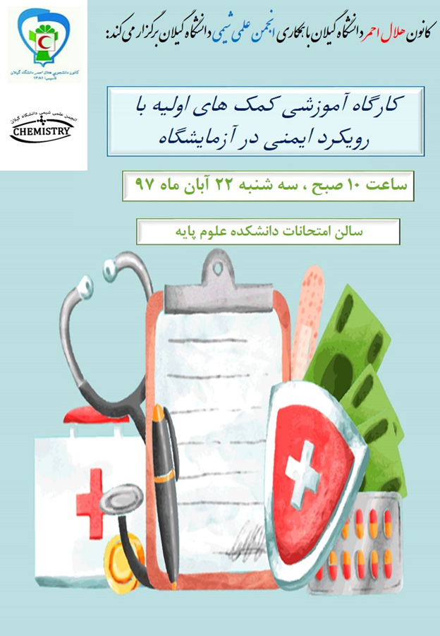 کارگاه آموزشی کمک های اولیه با رویکرد ایمنی در آزمایشگاه مورخ 22 آبان ماه 97 از ساعت 10 الی 14 با در دو بخش در سالن امتحانات دانشکده علوم پایه دانشگاه گیلان برگزار شد. این دوره که به همت کانون دانشجویی هلال احمر و با همکاری انجمن علمی دانشجویی شیمی دانشگاه گیلان برگزار گردید با استقبال بیش از صد نفر دانشجو و تکمیل ظرفیت سالن مواجه شد. محورهای آموزش عمومی تشخیص نوع امداد مورد نیاز و کمک های اولیه لازم متناسب با خطرات توسط الهه دستینه مدرس رسمی سازمان هلال احمر، آموزش داده شد و همچنین در بخش دوم نماینده سازمان انتقال خون با برپایی جلسه ای موثر به فرهنگ سازی در زمینه انتقال خون، تشریح نیازهای سازمان و نیاز بیماران سرطانی به موضوع پلاکت، پرداخت.