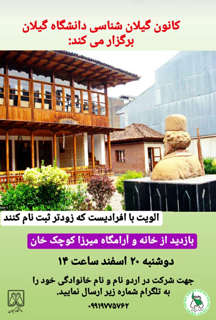 کانون دانشجویی گیلان شناسی دانشگاه گیلان با هدف آشنا شدن دانشجویان با شخصیت های بزرگ استان گیلان بازدید فرهنگی تفریحی خانه و آرامگاه میرزاکوچک خان را در تاریخ 20 اسفند ماه 97 برگزار نمود.