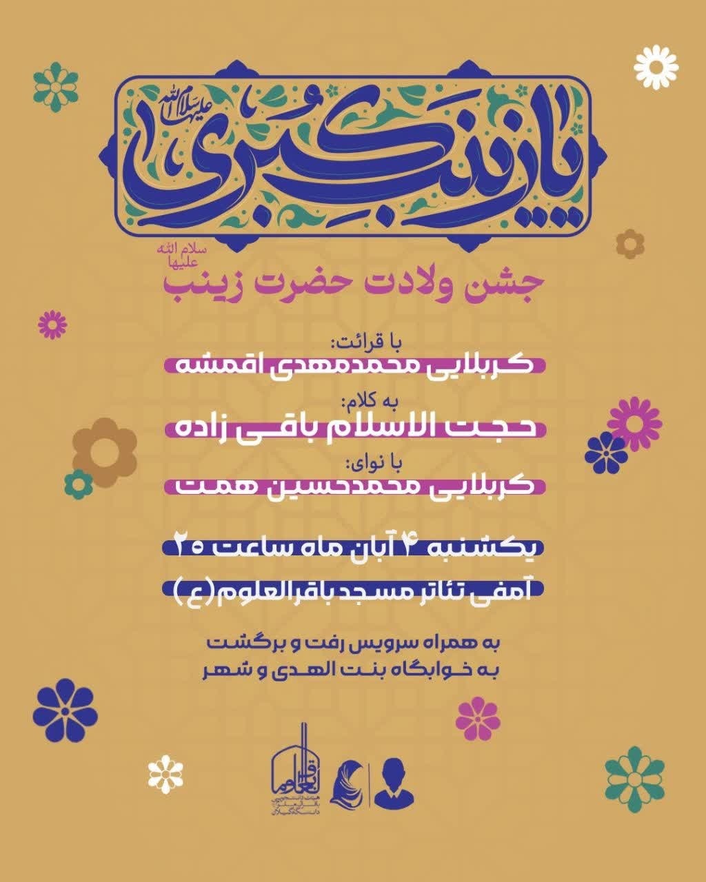 به همت هیئت دانشجویی باقرالعلوم(ع) جشن میلاد حضرت زینب(س) با حضور قاری محمدمهدی اقمشه و سخنرانی حجت‌الاسلام باقی‌زاده و مولودی‌خوانی کربلایی محمدحسین همت به همراه قرعه‌کشی و اهدای جایزه روز یکشنبه ۴ آبان ماه ۱۴۰۴ در آمفی تئاتر مسجد باقرالعلوم(ع) دانشگاه‌گیلان برگزار گردید.