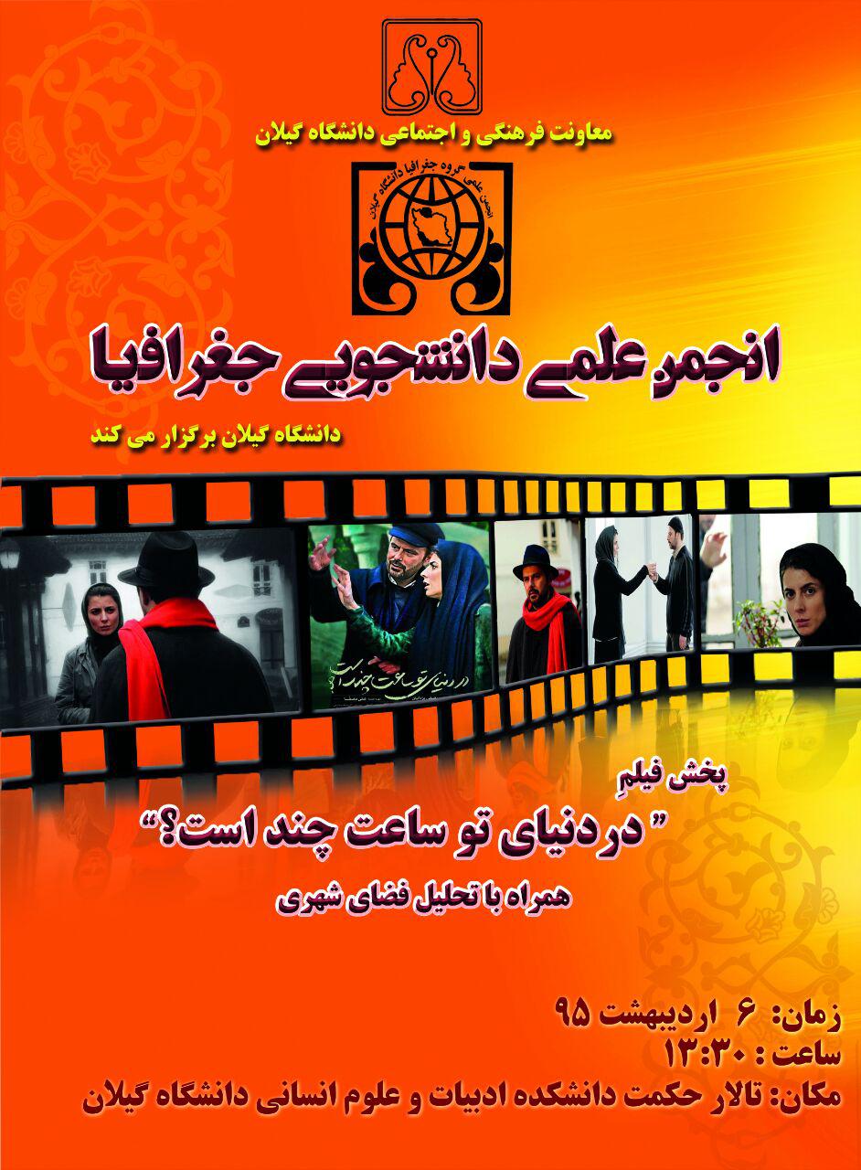 انجمن علمی دانشجویی جغرافیا دانشگاه گیلان برای آشنایی هر چه بیشتر دانشجویان با فضای شهری علی الخصوص شهر رشت که یکی از شهرهای استان گیلان است این طرح را اجرا نمود. پخش فیلم «در دنیای تو ساعت چند است؟»در روز دوشنبه مورخه 95/02/06 در تالار حکمت دانشکده ادبیات و علوم انسانی برگزار گردید. فیلم «در دنیای تو ساعت چند است؟» به کارگردانی صفی یزدانیان که روایتی از بازگشت گلی (لیلا حاتمی) بعد از 20 سال از فرانسه و جامعه ای به مراتب مدرن تر به زادگاهش شهر رشت است را بازگو می کند و فضایی نوستالژیک برای او تداعی می کند. فیلم برداری و قاب بندی آن در کوچه های قدیمی شهر رشت، لاهیجان و بندر انزلی و بازار سنتی رشت و همچنین منزل مسکونی بسیار قدیمی و این حس نوستالژیک را برای مخاطب نیز تداعی می کند. در این فیلم خبر از جامعه ای مدرن و تکنولوژی های ارتباطی عصر حاضر نیست و فیلم ساز تلاش کرده تا دنیایش عاری از هر گونه عناصر جامعه صنعتی باشد.