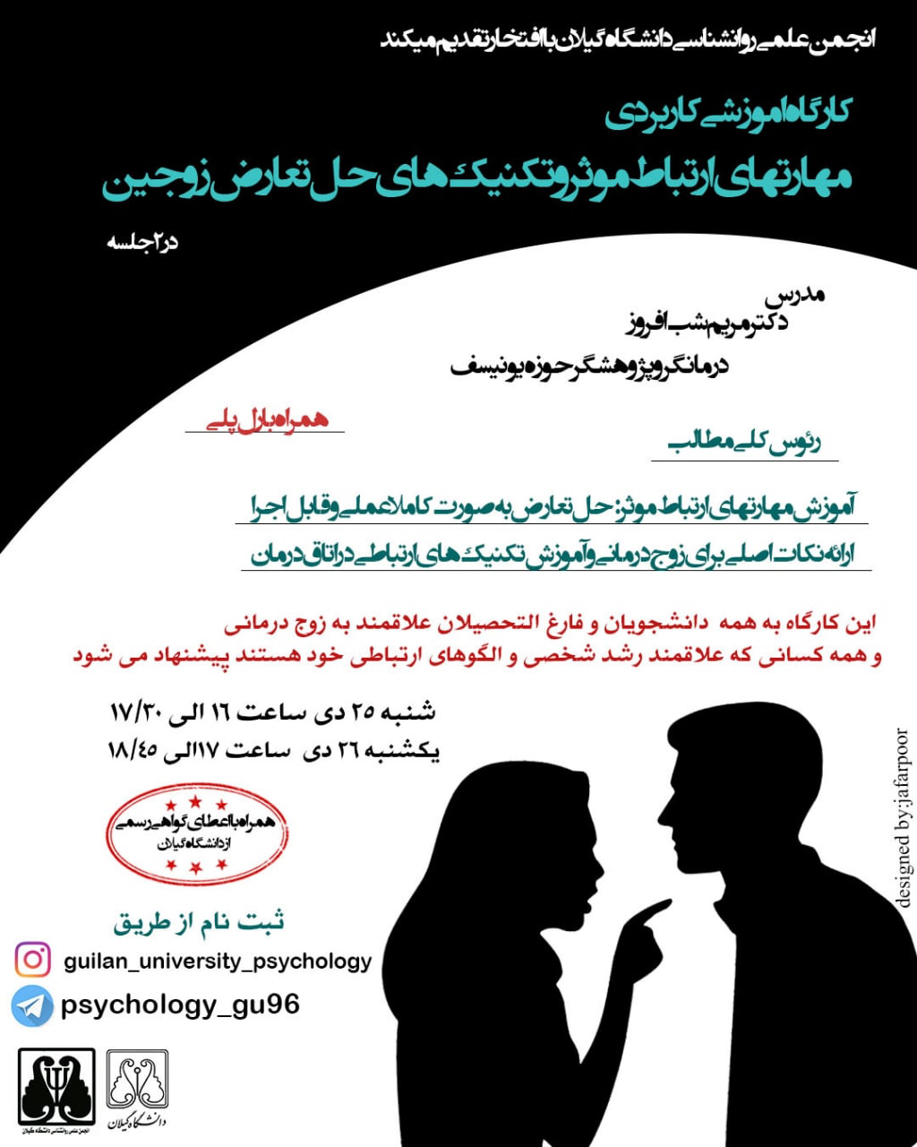 این کارگاه طی دو جلسه4 ساعته در تاریخ 9/14 و 9/21 در مرکز مشاوره دانشگاه گیلان برگزار شد و دانشجویان روانشناسی در آن حضور داشتند.