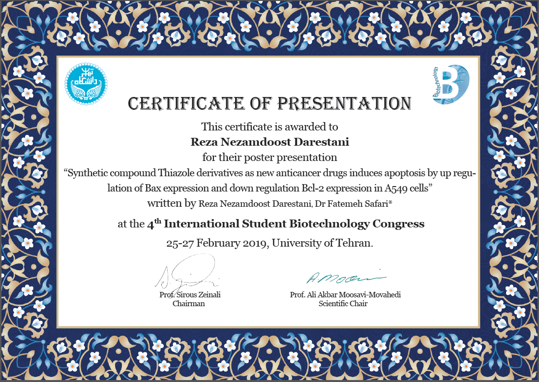 تحقیقات در این زمینه از تابستان پارسال با همکاری دانشکده داروسازی دانشگاه تهران در دانشکده علوم پایه دانشگاه گیلان به سرپرستی  خانم دکتر صفری ؛ عضو هیئت علمی گروه زیست شناسی ادامه پیدا کرد که در این بخش از پروژه و درواقع بر روی رده های سلول سرطانی ریه و پستان ، در قالب ارائه پوستر در هشتمین کنگره بین المللی زیست شناسی 2018 که در تابستان امسال در مراغه برگزار شد ، دفاع گردید.لازم به ذکر است این پروژه همچنان ادامه دارد و درحال اجرایی شدن آزمایشات در سطح  in vivo می باشد.قسمت دوم این پژوهش در تاریخ 6تا8 اسفند97 در کنگره بیوتکنولوژی پزشکی تهران دفاع شد و همچنین داده های نهایی در قالب یک مقاله برای داوری به ژورنال مربوطه ارسال گردیده است.