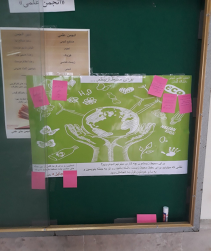 به پیشنهاد بنیامین کلاچاهی ثابت(دبیر انجمن علمی شیمی) برد انجمن های علمی و بردی در دفتر انجمن های علمی در دانشکده در نظر گرفته شد تا دانشجویان با چسباندن استیکر، نقش قابل اجرای خود را در تمام زیرمجموعه های حفظ و حراست از محیط زیست مشخص کنند و با نوشتن قول انجام آن، خود را ملزم به اجرای این نقش ببینند. حفاظت از محیط زیست، عبارتست از تلاشی که به منظور حفظ سلامتی محیط و انسان‌ها، در سطوح شخصی، سازمانی یا دولتی، از محیط طبیعی  محافظت می‌کند. حفاظت از موجودات زنده، به دلایل زیر ضروریست: حفظ زنجیرهٔ حیات. حفظ گنجینه درمانی.حفظ انبار وسیع منابع, و.... هدف در این طرح که به شکل ایجاد کمپین دانشجویی در حوزه محیط زیست بود ایجاد فضایی بود که ذهن هر دانشجو برای چند دقیقه به  نقشی که میتواند برای حفظ و حراست از محیط زیست داشته باشد معطوف شود و پس از پیدا کردن جایگاه خود در این حلقه لازم و گسترده با نوشتن جمله ای اراده و ناخودآگاه درونی خود را ملزم به رعایت آن نقش ببیند.با حضور طیف گسترده ای از دانشجویان در ترویج امر حفظ محیط زیست با تمام زیرمجموعه های آن فرهنگ سازی در این حوزه به سرعت پیشرفت می کند و با همین سرعت به مرحله ی عمل می رسد.