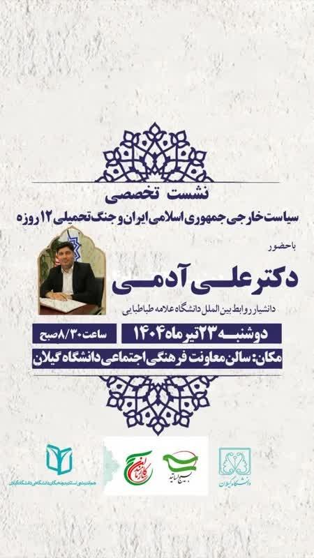 نشست تخصصی واکاوی سیاست خارجی جمهوری اسلامی ایران در جنگ تحمیلی ۱۲ روزه با رژیم صهیونیستی در دانشگاه گیلان برگزار شد نشست تخصصی با عنوان «سیاست خارجی جمهوری اسلامی ایران و جنگ تحمیلی ۱۲ روزه » روز شنبه ۲۳ تیرماه ۱۴۰۴ در سالن جلسات معاونت فرهنگی و اجتماعی دانشگاه گیلان برگزار شد. در این نشست که با سخنرانی دکتر علی آدمی، دانشیار روابط بین‌الملل دانشگاه علامه طباطبایی برگزار شد، ابعاد مختلف جنگ ۱۲ روزه و مواضع دیپلماتیک جمهوری اسلامی ایران در برابر تجاوزات رژیم صهیونیستی مورد بررسی و تحلیل قرار گرفت. این نشست با همکاری دفتر هم‌اندیشی استادان و نخبگان دانشگاه، بسیج اساتید، بسیج کارکنان و معاونت فرهنگی و اجتماعی دانشگاه گیلان برگزار شد که با استقبال جمعی از استادان، یاوران علمی و دانشجویان علاقه‌مندان به حوزه سیاست خارجی همراه بود. دکتر آدمی در این نشست با تأکید بر اهمیت تببین، آگاه‌سازی و تحلیل علمی سیاست خارجی جمهوری اسلامی ایران در مواجهه با تهدیدات منطقه‌ای، تصریح کرد: ((شناخت دقیق تحولات منطقه‌ای و پاسخ‌های راهبردی ایران در عرصه بین‌الملل، ضرورتی اجتناب‌ناپذیر در تقویت امنیت ملی و ارتقاء جایگاه جمهوری اسلامی ایران در نظام بین‌الملل است)) این نشست فرصتی مغتنم برای تبادل نظر نخبگان دانشگاهی و تحلیل‌گران مسائل بین‌الملل در خصوص چالش‌های نوین سیاست خارجی ایران در برابر رژیم صهیونیستی به شمار می‌رفت.