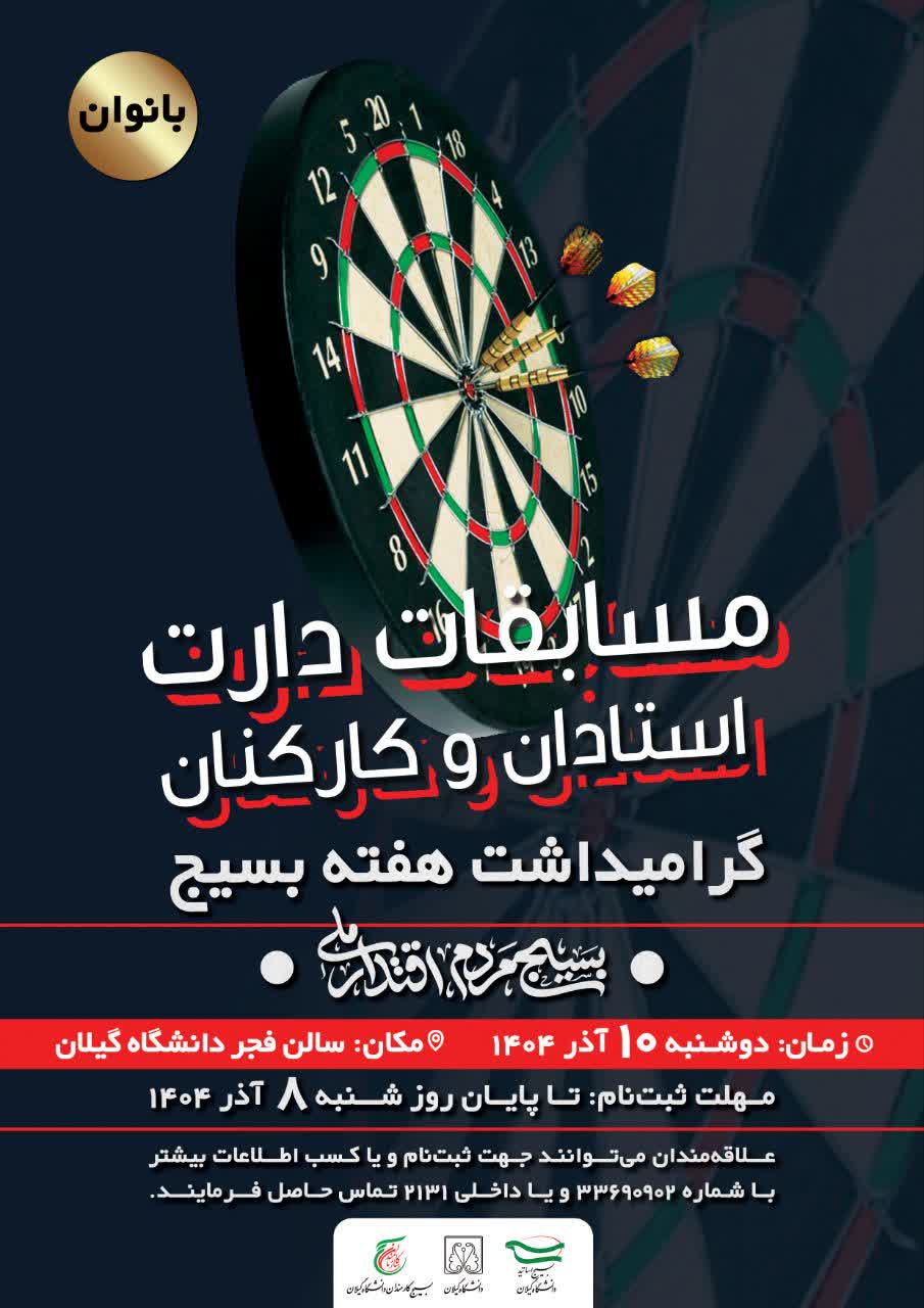 معاونت فرهنگی و اجتماعی به همت بسیج اساتید و بسیج کارکنان دانشگاه گیلان به مناسبت هفته بسیج مسابقه دارت ویژه بانوان را برگزار می کند.