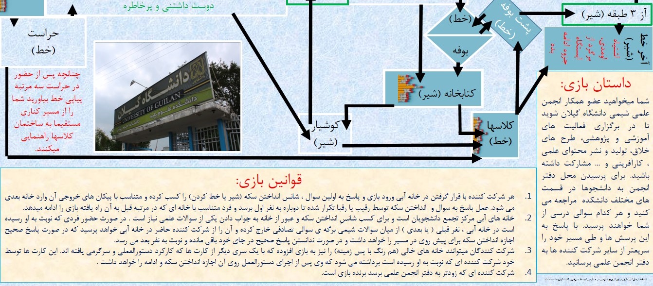 انجمن علمی دانشجویی شیمی دانشگاه گیلان برنامه بازی خلاقانه را در طی نیمسال اول تحصیلی 98-97  برگزار نمود.مکانیسم این بازی با محتوای علمی و سرگرمی برای ترویج شیمی در مدارس تهیه شد. با طرح سوالات شیمی دبیرستان و طرح سوالات و کارت های متنوع و طراحی صفحه بازی رومیزی که مسیر آن از ورودی دانشکده علوم پایه تا دفتر انجمن های علمی را نشان می دهد. این بازی خلاقانه شکل گرفت که ضمن ارائه در هفته جهانی بازی به دانشجویان و دانش آموزان به دنبال بهبود و به روز رسانی بازی علمی باشد. بازی خلاقانه ضمن آشنایی دانش آموزان با علم شیمی و آشتی با مطالعه فراکتاب، در کد دهی برای طرح های خلاقانه در دانشگاه مفید است. مسابقه آموزشی به منظور تحقق هدف های یک برنامه درسی طراحی میشوند.از مهم ترین هدف های یک مسابقه, آسان کردن مفاهیم یادگیری است.آمیختگی بازی با آموزش به همگان نشاط می بخشد و سبب می شود با آرامش بیشتری به کمک پیام های موجود در بازی,با مفاهیم ارتباط برقرار کنند و به تجزیه و تحلیل آنها بپردازند. به طور کلی غنی تر کردن شکل یادگیری هدف مسابقه آموزشی است.