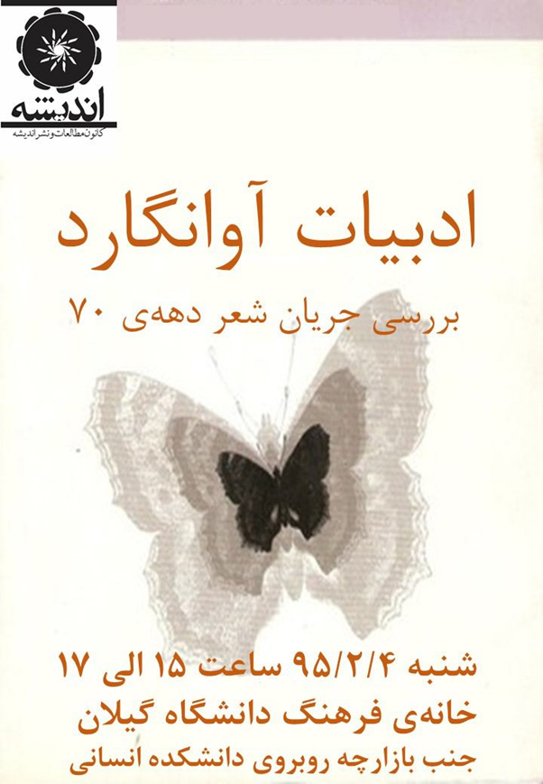 اولین جلسه از این سری با عنوان ادبیات آوانگارد درتاریخ 95/02/04در خانه فرهنگ دانشگاه گیلان به مدت دو ساعت برگزار گردید.