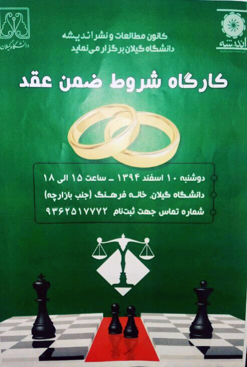 کانون مطالعات و نشر اندیشه دانشگاه گیلان در روز دوشنبه 10 اسفند ماه سال 1394 در ساعت 15 الی 18 جلسه ای 3 ساعته را تحت عنوان کارگاه شروط ضمن عقد برای دانشجویان دانشگاه گیلان در مکان خانه فرهنگ برگزار نمود. این کار گاه با حضور یک حقوق دان و تسهیل گر برگزار شد. در این کارگاه ابتدا خانم سحر روان حقوق دان با آماده کردن اسلاید هایی به ارائه تعاریف حقوقی مربوط به شروط عقد نکاح پرداختند و سپس در مورد حقوق و وظایفی که طرفین ازدواج دارا می باشند و یا می توانند به عنوان شروط طرفین به ثبت برسانند صحبت کردند. در ادامه دانشجویان حاظر سوالهای خود را از پرسیدند و بعد از پاسخگویی به سوالات حضار به بررسی حقوقی و اجتماعی چند نمونه از مشکلات خانوادگی که در جامعه وجود دارد بحث گردید. این جلسه با استقبال خوبی از دانشجویان خانم خوابگاه دانشگاه همراه بود و و خواستار دنبال دار بودن این کار گاه ها به خصوص با محوریت زنان بودند.