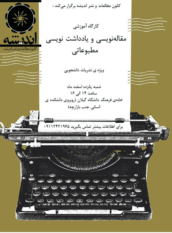 کانون مطالعات و نشر اندیشه در تاریخ 15و 18 اسفند ماه سال 1394 کارگاه آموزشی با محوریت مقاله نویسی و یادداشت نویسی مطبوعاتی ویژه ی نشریات دانشجویی در خانه فرهنگ دانشگاه گیلان برگزار نمود. این کارگاه در دو جلسه 2 ساعته برگزار شدو طی آن به مواردی چون مقاله نویسی، یادداشت، نقد، قلم، مصاحبه، و... توسط مدرس پرداخته شد. در این جلسات بیشتر از دانشجویانی که علاقمند به نوشتن در نشریات دانشجویی بودند شرکت داشتند. در کارگاه نمونههایی از مقاله های خوب و قابل توجه بررسی شد و قسمتهای مختلف از بدنه ی مقاله های ژورنالیستی از جمله عنوان، متن اصلی، سوتیتر و حتی چگونگی طراحی برای جذابیت بیشتربصری مورد توجه قرار گرفت. و به نکاتی در مورد ویراستاری متون نشریات و چگونه کار کردن بر روی جلد و صفحه بندی نیز اشاره شد.