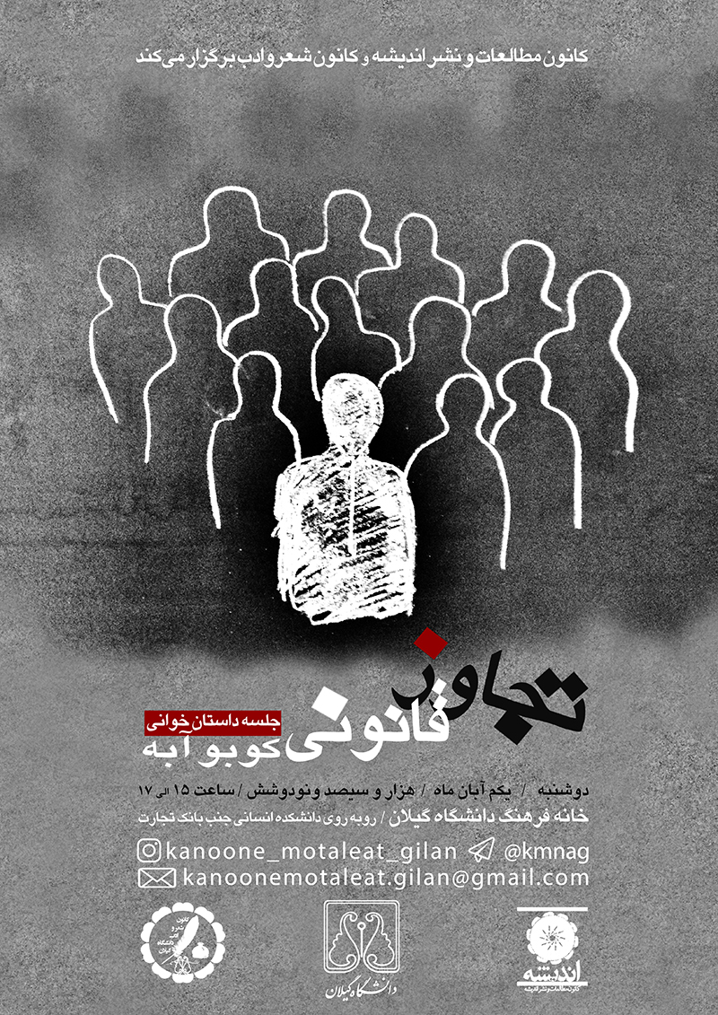 در این جلسه که در تاریخ 96/08/01 از ساعت 15 الی 17 در خانه ی فرهنگ دانشگاه گیلان برگزار شد، تجاوز قانونی داستانی از نویسنده ی ژاپنی، کوبو آبه توسط دبیر کانون مطالعات خوانده شد. بعد از بحث و گفتگو در مورد داستان و نویسنده ی آن، داستان از زاویه های مختلف مورد نقد قرار گرفت.